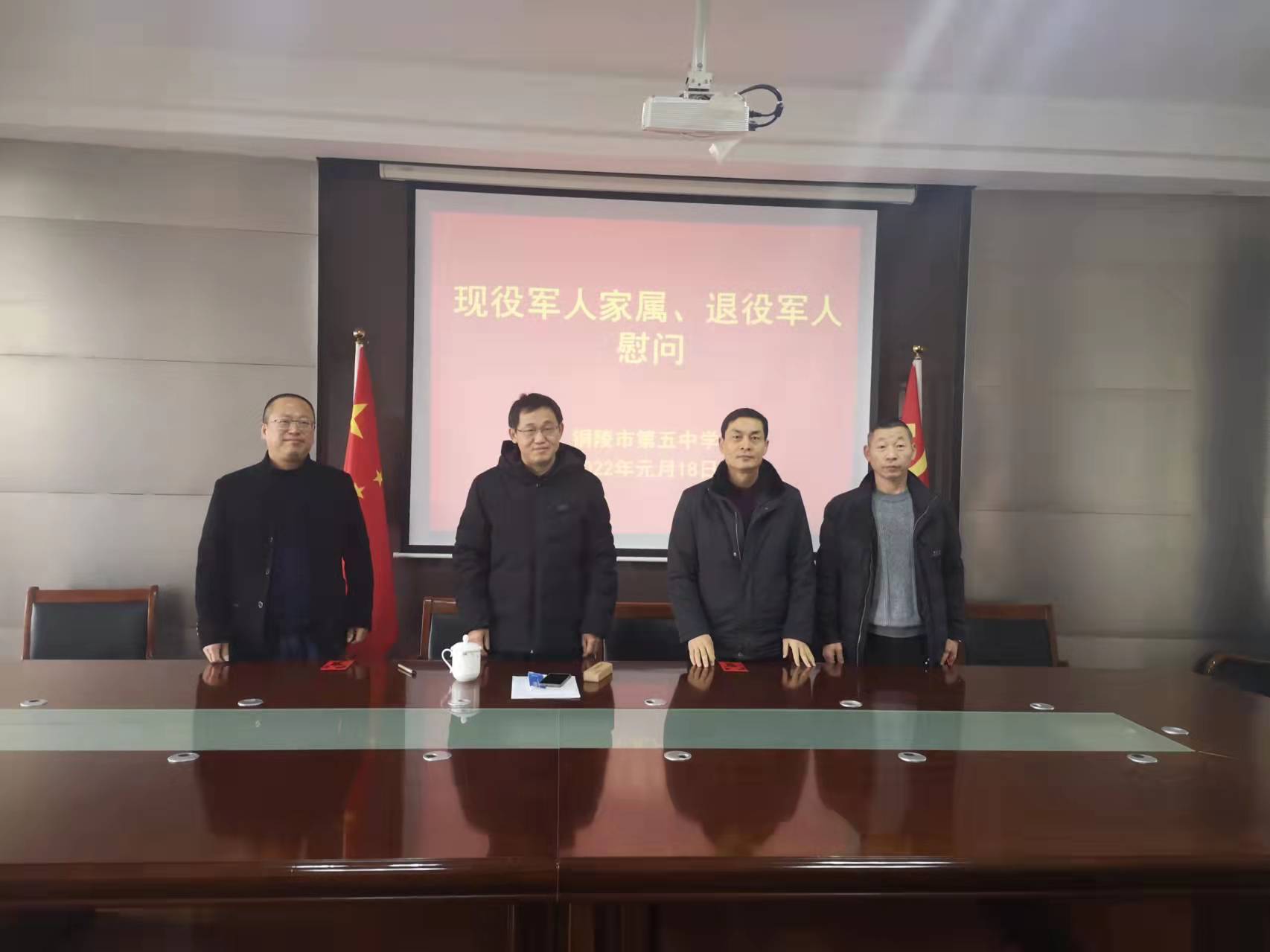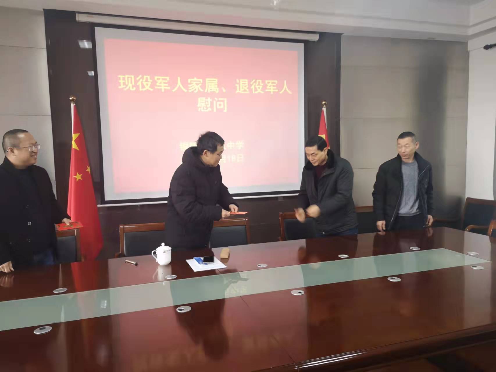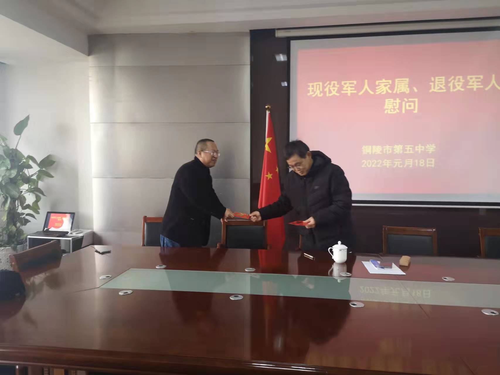 1月18日上午,市五中組織擁軍慰問活動。校黨支部書記校長沐揚與,F(xiàn)役軍人家屬和退役軍人親切交談,了解孩子在部隊的生活和工作情況。沐揚同志還代表學校向每位現(xiàn)役軍人家屬和退役軍人發(fā)放了慰問金,希望孩子們能為國防建設(shè)做出積極的貢獻。