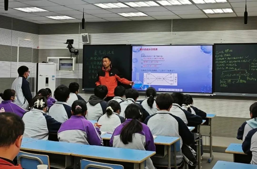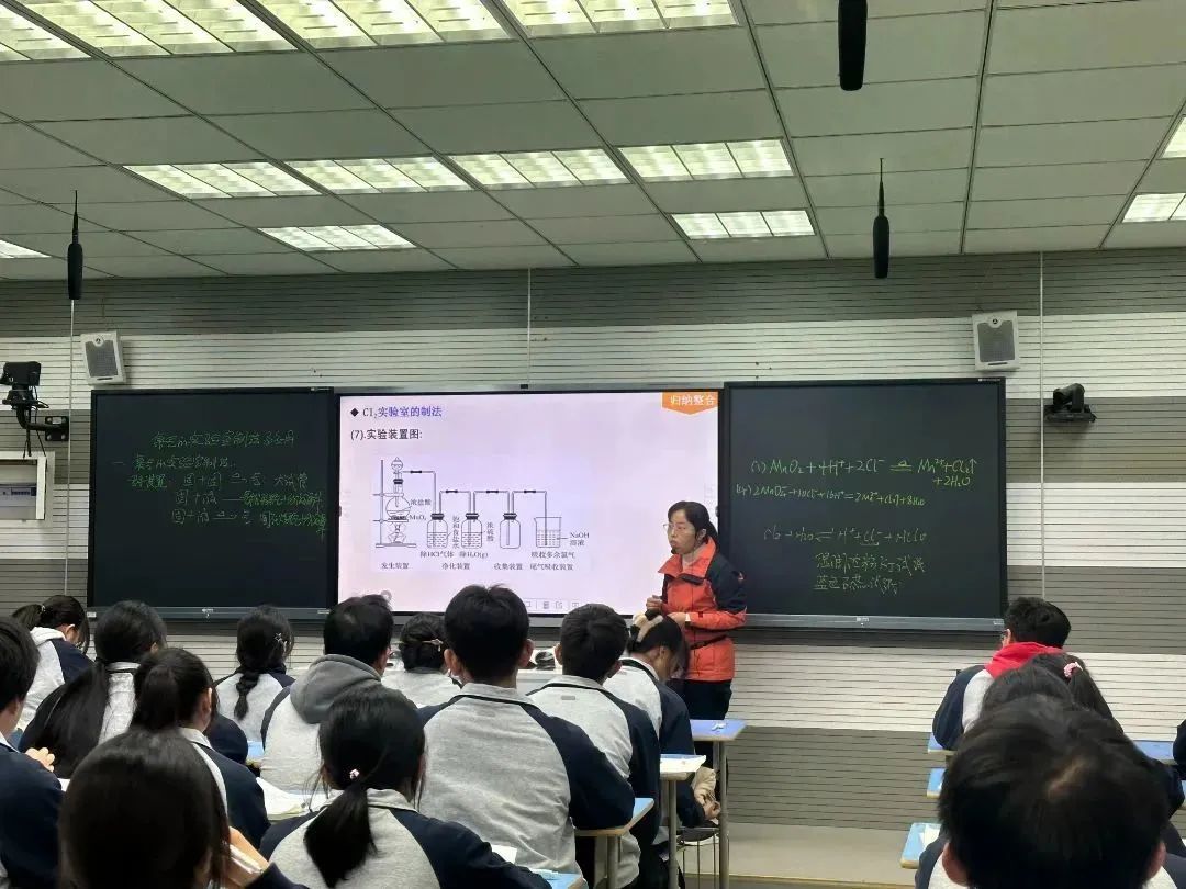 王瑋老師以“氯氣的制取”為題進(jìn)行公開課教學(xué)。王老師以高考題引入,從氯氣的制取原理出發(fā),讓學(xué)生復(fù)習(xí)如何書寫氯氣制取的化學(xué)方程式,根據(jù)反應(yīng)物狀態(tài)和反應(yīng)條件,如何選擇合適的儀器,根據(jù)氯氣中存在雜質(zhì)的種類,選擇合適的除雜試劑,如何進(jìn)行尾氣處理,工業(yè)上如何制取氯氣等知識點,最后以分析一道高考題結(jié)束。王老師講解的非常細(xì)致,本課設(shè)計貼合五中學(xué)生實際,有很強(qiáng)的教學(xué)操作性,展示了王老師扎實的教學(xué)基本功。