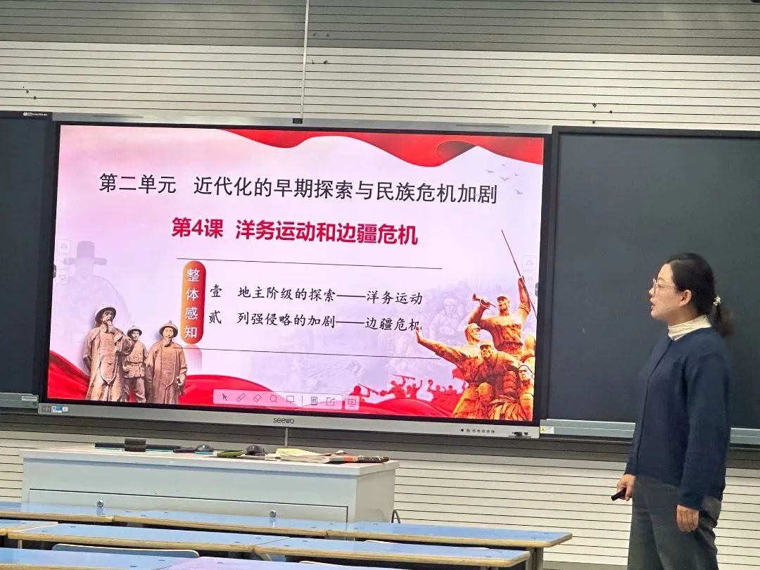 王捷頻老師以“洋務(wù)運動和邊疆危機”為題進行說課。王老師在深入分析課標(biāo)、教材和學(xué)情的基礎(chǔ)上,從教學(xué)目標(biāo)、教學(xué)重難點、教學(xué)方法、教學(xué)過程等方面闡述了教學(xué)思路,通過設(shè)計“內(nèi)憂外患,路在何方”“自強求富,艱難起步”“甲午海戰(zhàn),自救失敗”“一分為二,道阻且長”四個模塊探究洋務(wù)運動的背景、內(nèi)容、結(jié)果及影響,以“海防與塞防之爭”的課堂辯論引導(dǎo)學(xué)生認識清政府面臨的邊疆危機,并以唯物史觀的視角辯證看待晚清政府的近代化探索。本課設(shè)計貼合五中學(xué)生實際,有很強的教學(xué)操作性,展示了王老師扎實的教學(xué)基本功。