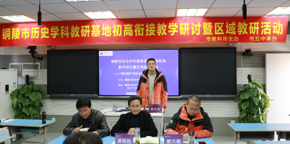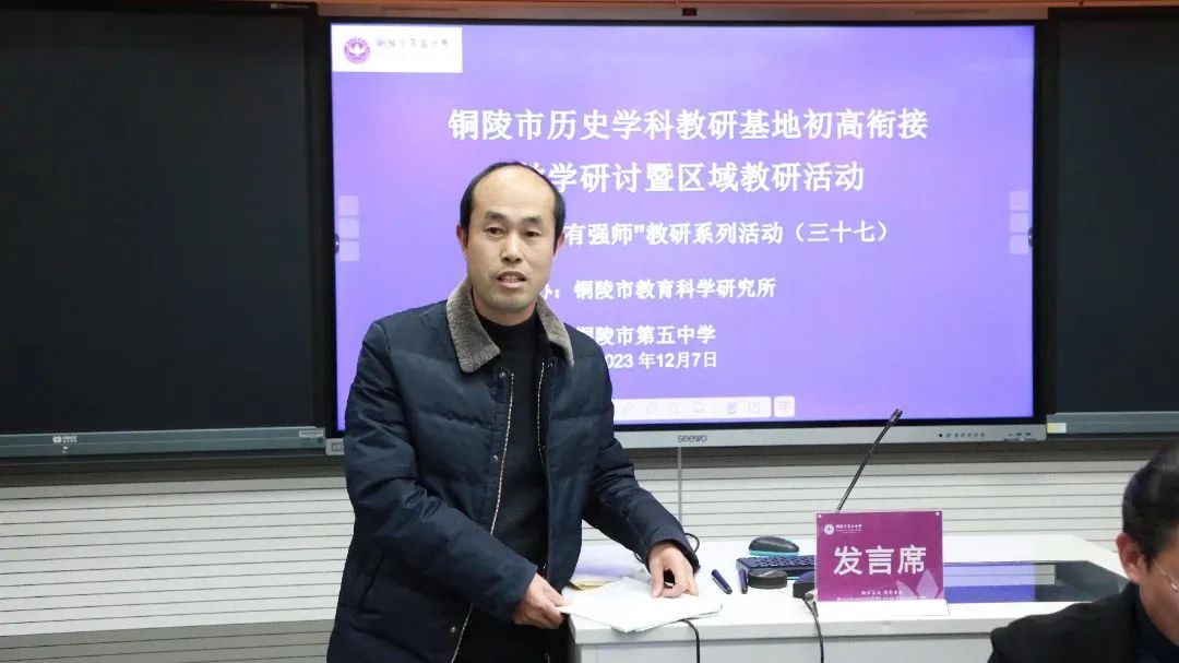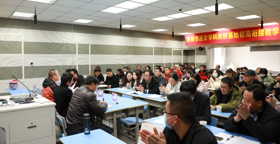 為進一步探索新時代初高中貫通培養(yǎng)新路徑,全面推進新一輪基礎(chǔ)教育課程改革,12月7日上午,銅陵市歷史學(xué)科教研基地初高銜接教學(xué)研討暨區(qū)域教研活動在我校錄播教室成功舉行。市教育科學(xué)研究所副所長、歷史教研員盛銅勝,校黨總支書記、校長張尤俊,校黨總支委員、工會主席瞿大寨出席活動,特邀專家錢要武以及各縣區(qū)、市直(民辦)學(xué)校近100余名歷史教師參加活動。