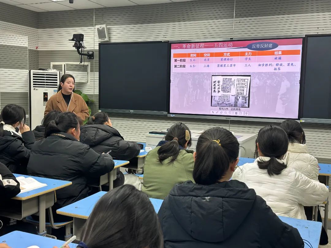 王毛毛老師的授課課題是“五四運(yùn)動(dòng)與中國共產(chǎn)黨的誕生”。王老師以“革命新生”為主線,從“革命新征程——五四運(yùn)動(dòng)”、“革命新領(lǐng)導(dǎo)——中國共產(chǎn)黨的誕生”和“革命新策略——國共合作與國民革命”這三個(gè)板塊闡釋主題,并輔以相應(yīng)習(xí)題檢驗(yàn)學(xué)生所學(xué)。本課設(shè)計(jì)線索清晰,教學(xué)過程流暢,貼近五中學(xué)情,展現(xiàn)了王毛毛老師扎實(shí)的教學(xué)基本功。