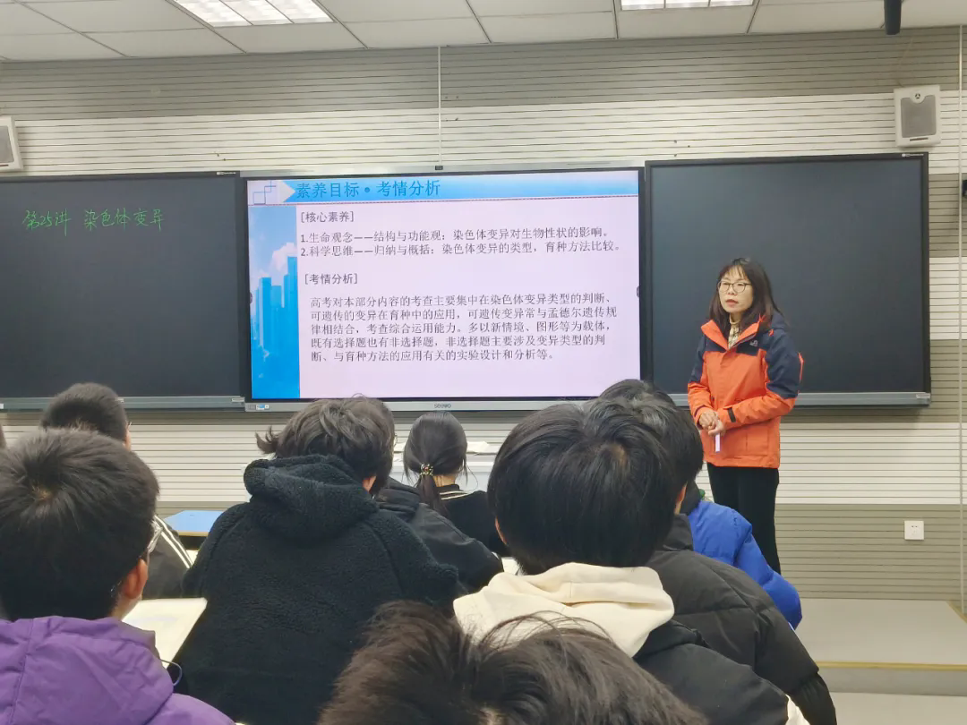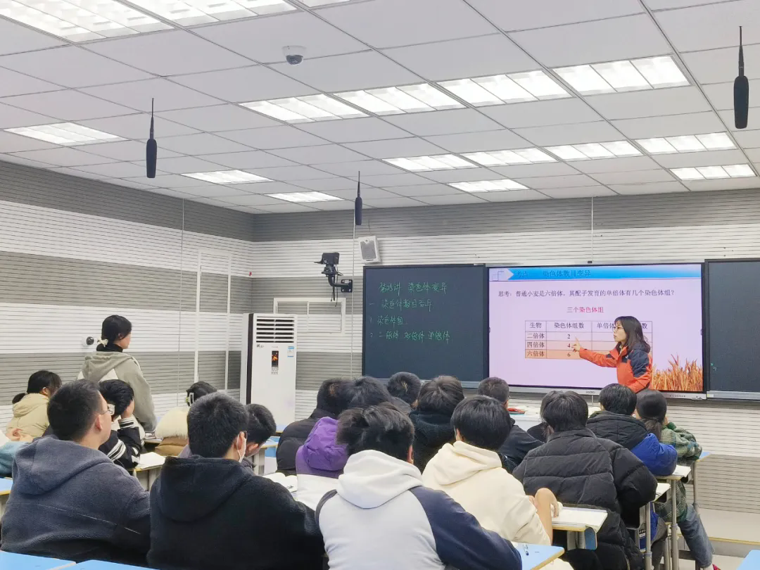 周文娟老師授課的主題是《染色體變異》。她首先用“唐氏兒患者”的視頻引出染色體變異,并回顧染色體變異的概念和類型。接著,她用概念和實(shí)例相結(jié)合,幫助學(xué)生掌握染色體組的知識(shí)點(diǎn),并讓學(xué)生歸納其特點(diǎn)。最后,她通過PPT展示高考真題,幫助學(xué)生進(jìn)一步鞏固和提升。本節(jié)課知識(shí)點(diǎn)覆蓋全面,題目鏈接高考,學(xué)生們受益匪淺。