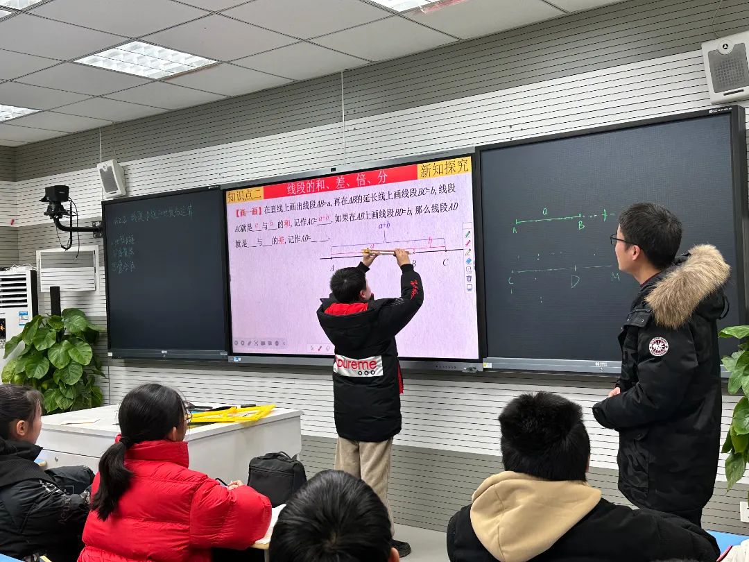 袁君老師的授課內容為七年級上冊《線段長短的比較與運算》,本課教學重難點是對·圖形和數(shù)量認識的結合。袁君老師采取問題引入教學,通過提出問題“如何比較兩個同學的身高?”,鼓勵學生獨立思考解決辦法,啟發(fā)學生歸納線段比較的兩種方法:度量法和疊合法。課堂導入自然,充分考慮到學生認知特點,同時引入具有趣味性,激發(fā)學生的興趣,體現(xiàn)了數(shù)學與生活的聯(lián)系。