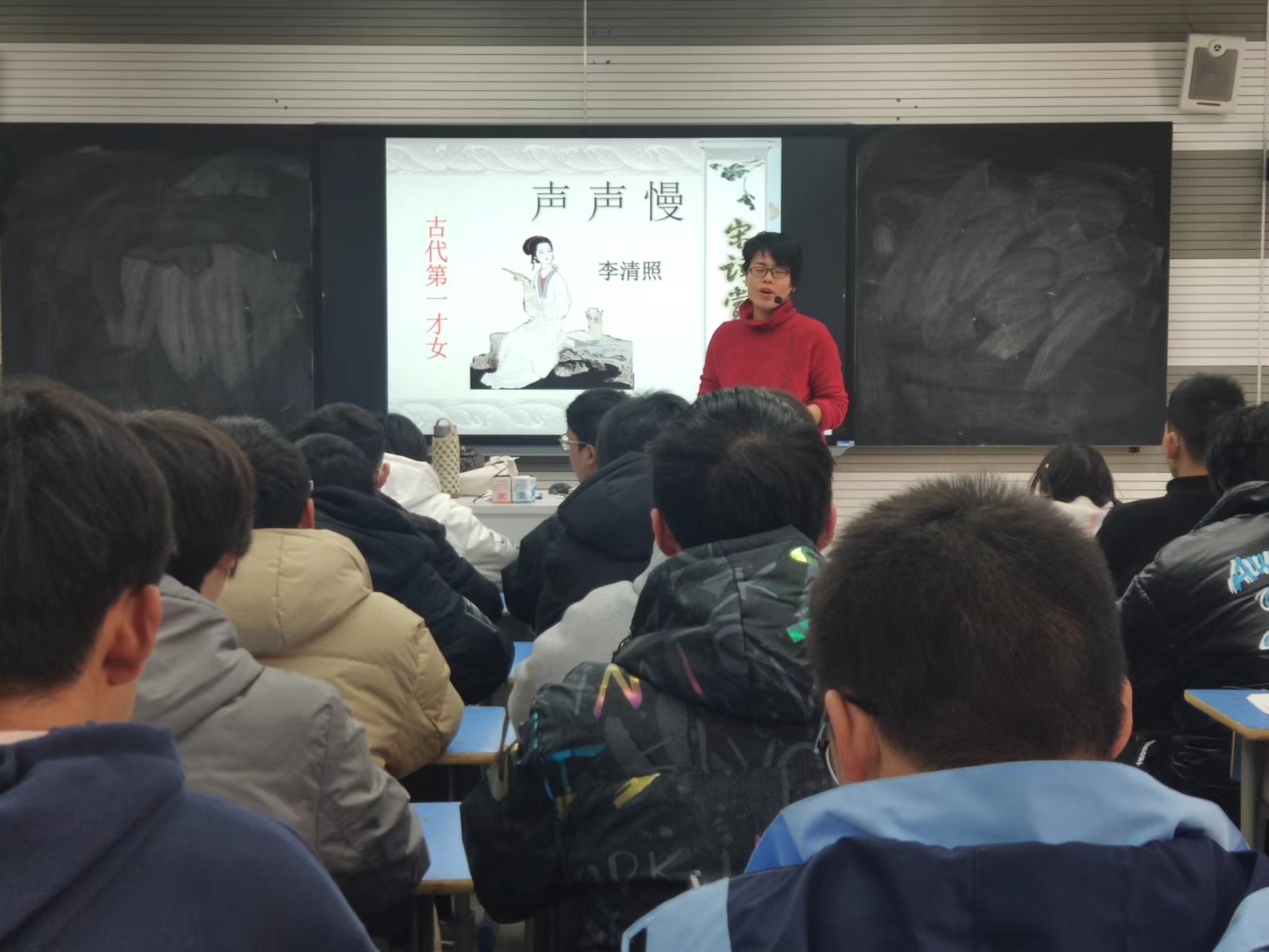 12月14日下午,校語文教研組在階梯教室開展公開課教學研討活動,任娟老師展示了李清照《聲聲慢》的教學過程。課上她帶領學生品讀詩歌,從聲韻和意象角度探究詩詞的藝術魅力。教學中她娓娓道來,聲情并茂,語言表達極富感染力。學生在任老師的引領下深入字里行間體情悟理,積極表達觀點看法,課堂氛圍活躍熱烈。