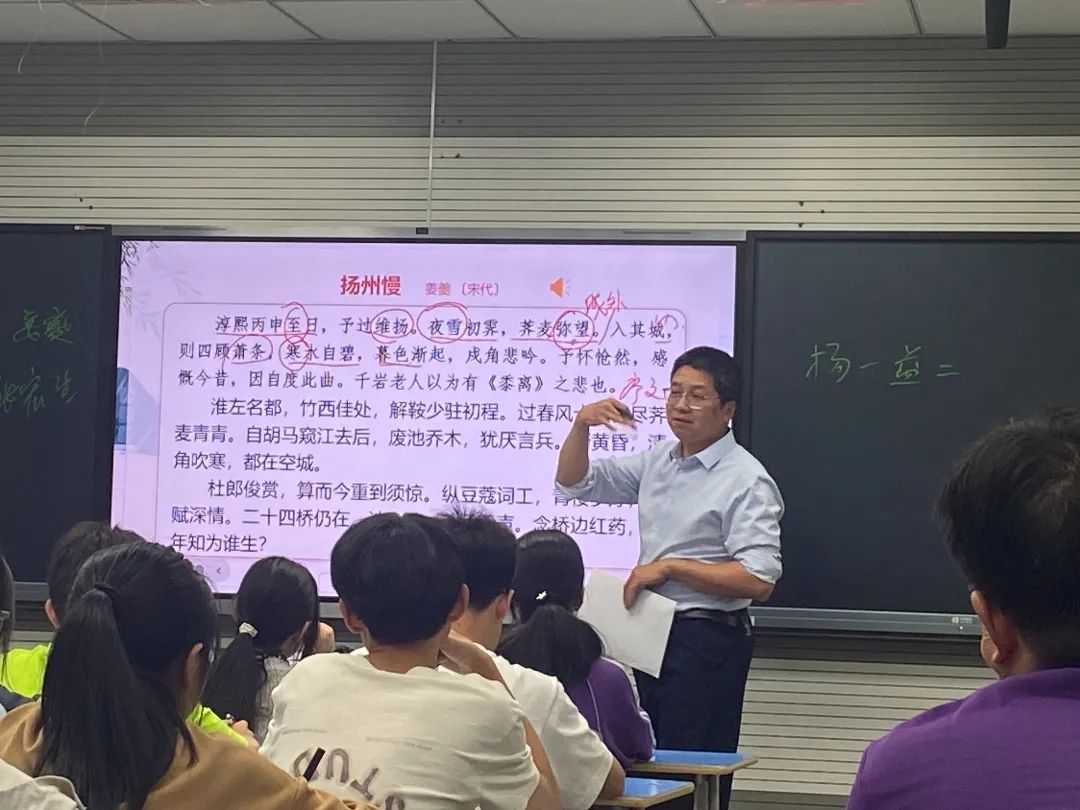 高彪老師開展《揚州慢》新課教學。高老師從揚州的古代詩詞出發(fā),逐句賞析姜夔在揚州戰(zhàn)敗十五年后的滿目瘡痍、斷壁殘垣的景象,從而帶領學生解讀屬于詩人感情至深的黍離之悲,繁華富麗的揚州在戰(zhàn)爭中衰敗,家國之仇與芍藥的繁盛對比后,意境蒼涼。高老師教學嚴謹扎實,旁征博引,循循善誘,詩詞的文化之厚展現(xiàn)的淋漓盡致。