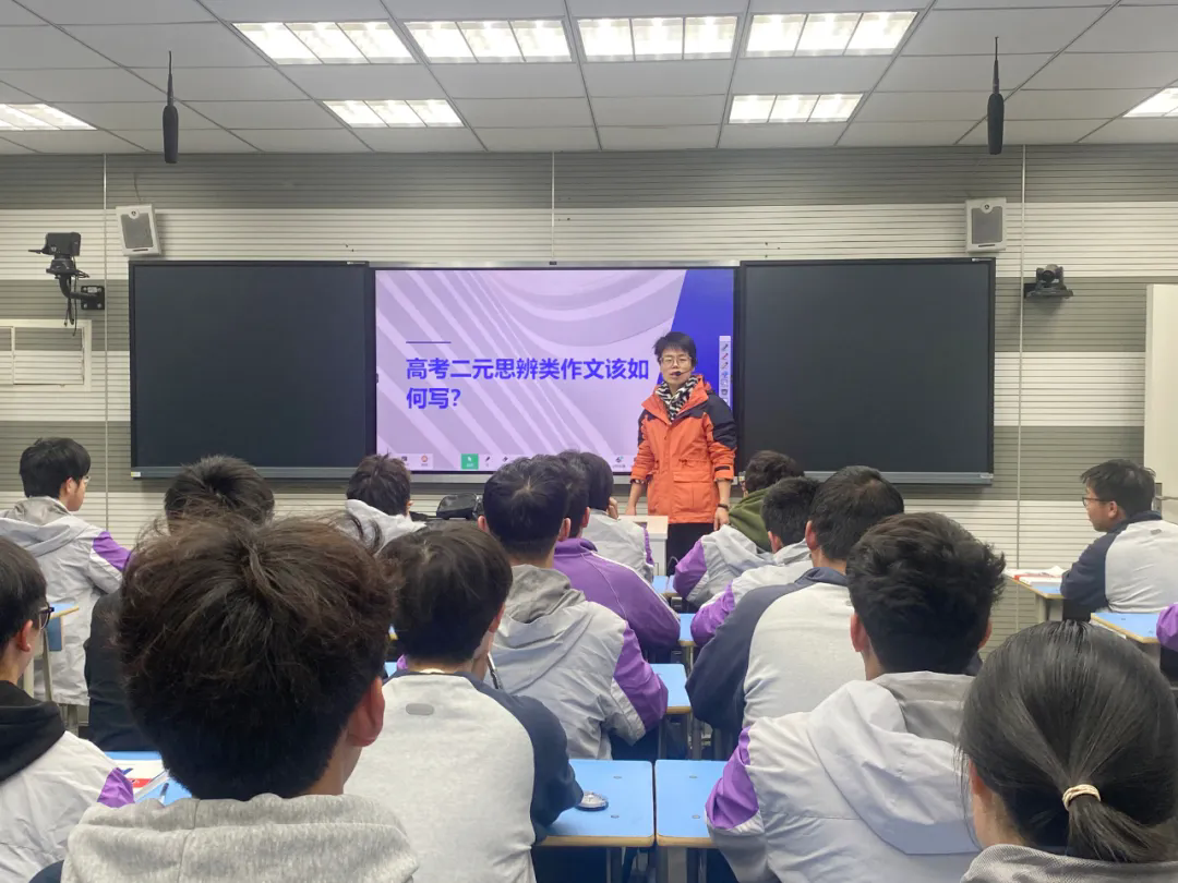 任娟老師授課的主題是《高三復(fù)習(xí)專題之二元思辨類作文》。她首先點(diǎn)出二元思辨的概念,并指出這一概念在高考作文中運(yùn)用的實(shí)例。接著,圍繞2022年和2023年高考作文真題逐步介紹二元思辨在內(nèi)在和外在的雙重思索下的命題和做文章的技巧。最后,介紹學(xué)生的常見誤區(qū),將誤區(qū)避免以完成作文思路的提升,讓學(xué)生在理解中感知作文審題時(shí)的小巧思,從而受益匪淺。