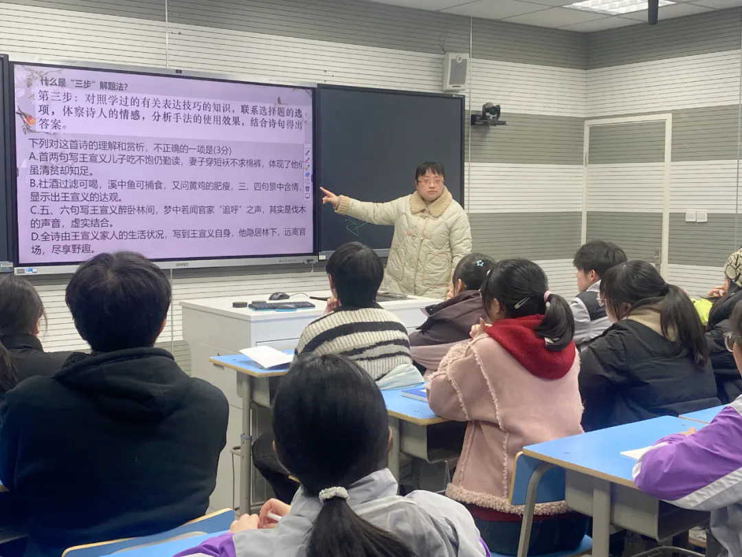 楊倩老師授課的主題是《高考專題復(fù)習(xí)之詩(shī)詞鑒賞主觀題》。楊老師運(yùn)用“三步解題法”分步驟給學(xué)生講授在詩(shī)詞鑒賞類型題目審題和答題時(shí)應(yīng)當(dāng)做到的具體事項(xiàng),將復(fù)雜的文章理解題變成一步一步的小模塊,更方便學(xué)生實(shí)際操作。接著,通過練習(xí)真題讓學(xué)生實(shí)際將所學(xué)化為己用,做到提高課堂效率,受人之漁。