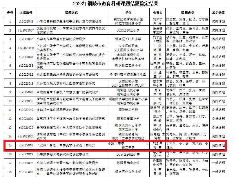 2023年銅陵市教育科研課題結(jié)題評審結(jié)果公布,我校有三項(xiàng)課題結(jié)題,其中有一項(xiàng)為良好課題!三項(xiàng)課題的負(fù)責(zé)人分別是劉永萍;張勝利、姜雪;柯志強(qiáng),吳成兵。