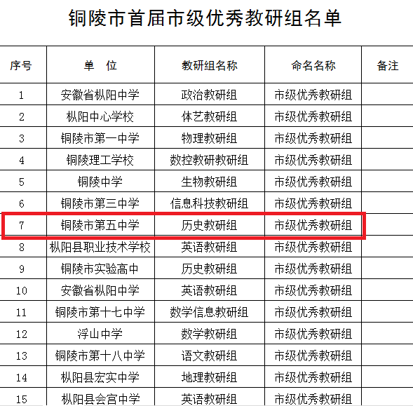 首屆全市中小學(xué)、幼兒園教研先進(jìn)單位、優(yōu)秀教研組、優(yōu)秀教研員評(píng)選結(jié)果已經(jīng)揭曉,銅陵市第五中學(xué)歷史組榮獲市級(jí)優(yōu)秀教研組榮譽(yù)稱號(hào)!