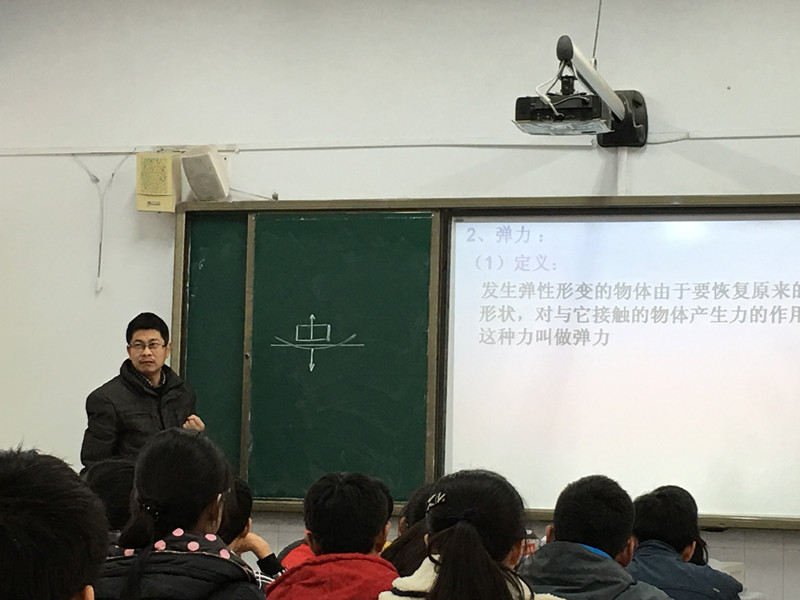 月1日上午第三節(jié)課,我校物理教研組舉行公開課及研討活動,所有組員全部到齊。鄭小軍老師在高101班進(jìn)行公開課教學(xué),講授的課題是“彈力”。鄭老師從“觀察橡皮筋的形變“的演示實驗開始導(dǎo)入本節(jié)課,通過大家周邊的事例來了解彈力。內(nèi)容豐富,重難點突出,課堂氣氛活躍。
