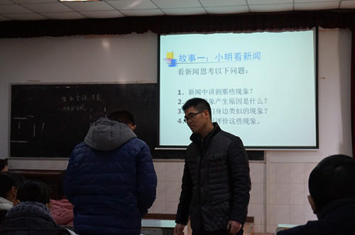 2015年12月18日上午第二節(jié)課,政治組程永生老師在階梯教室進行教學開放周公開課教學。程老師以“小明的故事”創(chuàng)設(shè)情景組織教學,設(shè)計精巧,課堂氣氛活躍,得到聽課老師的一致好評。