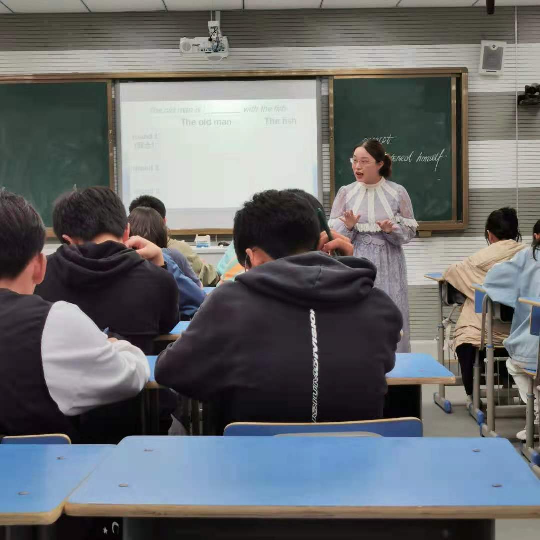 王澈老師則對(duì)《老人與海》一文進(jìn)行了深入淺出地剖析,帶領(lǐng)學(xué)生欣賞了海明威的寫作風(fēng)格,語言特點(diǎn),最后讓學(xué)生認(rèn)識(shí)到面對(duì)困難要不屈不撓,堅(jiān)持到底!