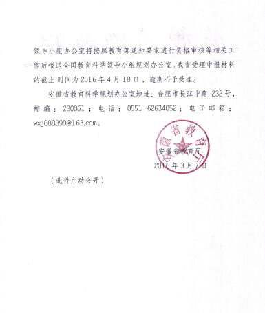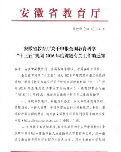 附件:安徽省教育廳關(guān)于申報(bào)全國教育科學(xué)“十三五”規(guī)劃2016年度課題有關(guān)工作的通知