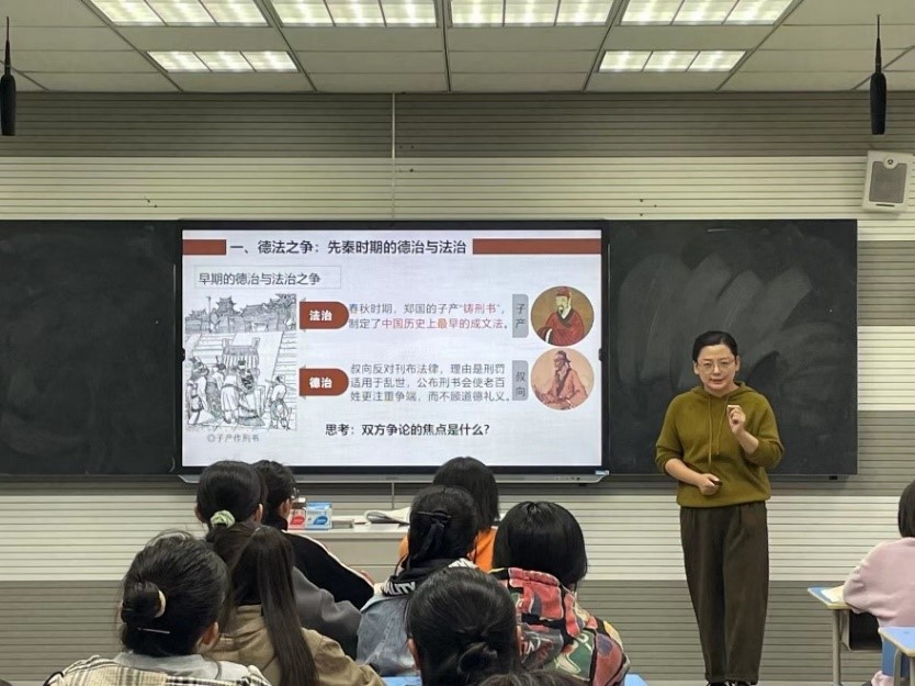 活動(dòng)首先由我校王捷頻老師和市三中張海峰老師,圍繞《中國(guó)古代的法治與教化》一課進(jìn)行同課異構(gòu)教學(xué)。王捷頻老師以現(xiàn)實(shí)中酒駕入刑及交警的勸誡引導(dǎo),引入本課“法律與教化”的主題,以“德法之爭(zhēng)”“儒法融合”“禮法合流”重新架構(gòu)本課內(nèi)容,通過(guò)環(huán)環(huán)相扣的問(wèn)題貫通古今,引導(dǎo)學(xué)生理解法治與教化的關(guān)系,認(rèn)識(shí)到“法安天下,德潤(rùn)人心”才能真正實(shí)現(xiàn)社會(huì)的有效治理。張海峰老師同樣以現(xiàn)實(shí)社會(huì)的“于歡案”來(lái)切入主題,通過(guò)建構(gòu)時(shí)空坐標(biāo),梳理先秦時(shí)期的德治與法治、封建社會(huì)法律儒家化以及封建社會(huì)的教化及鄉(xiāng)約法律化趨勢(shì),引導(dǎo)學(xué)生進(jìn)行深入的文本分析與解讀,最終達(dá)成教學(xué)目標(biāo)。兩位教師以各自獨(dú)特的教學(xué)設(shè)計(jì),使相同的課題展現(xiàn)出不同的風(fēng)采。