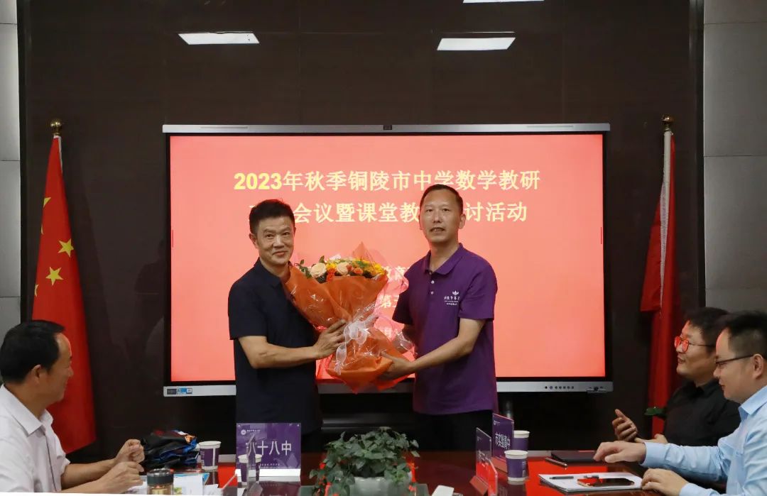 期間,在張尤俊校長的提議下,校黨總支委員、副校長呂建國代表五中全體教職工為即將榮譽退休的金超老師獻上一束鮮花,表達了大家對金老師深深的敬意!感謝他多年來深耕教研工作一線,不遺余力地為銅陵市數學教育教研工作辛勤付出!