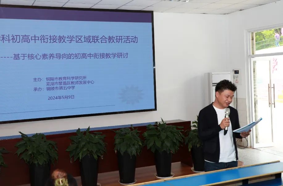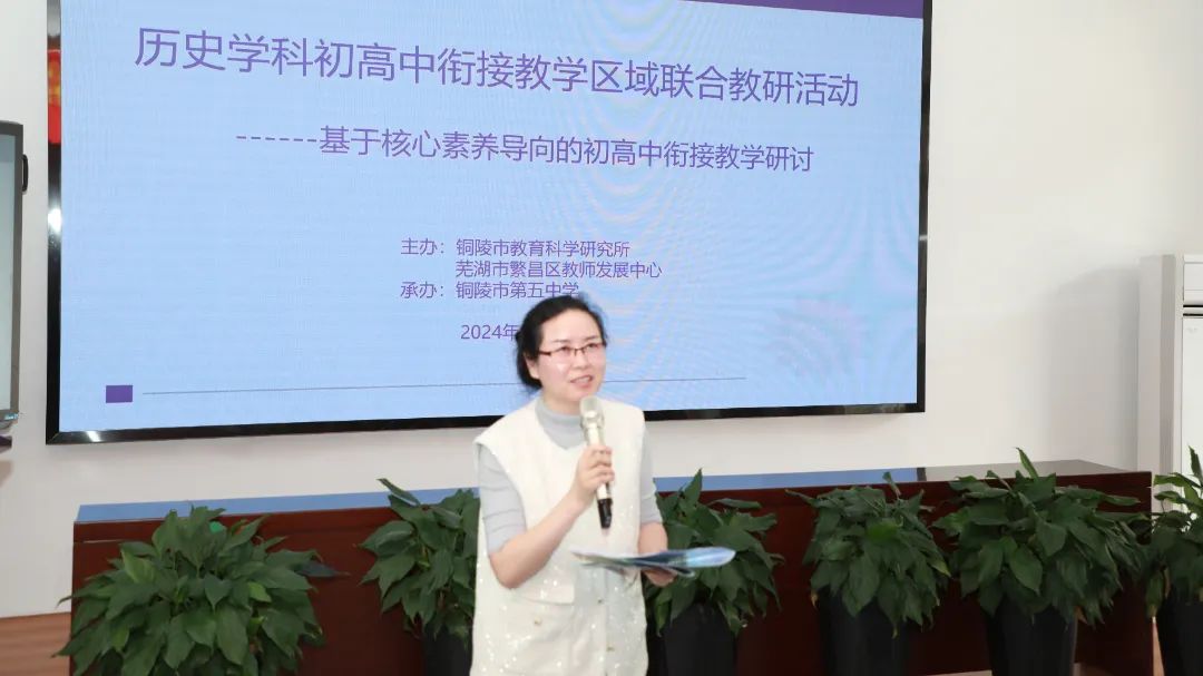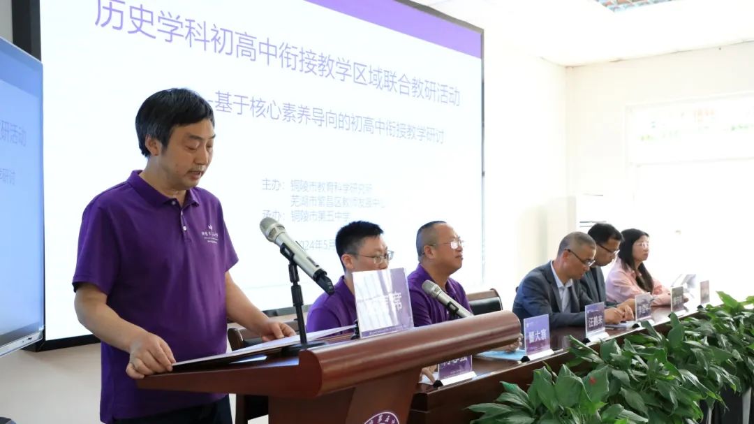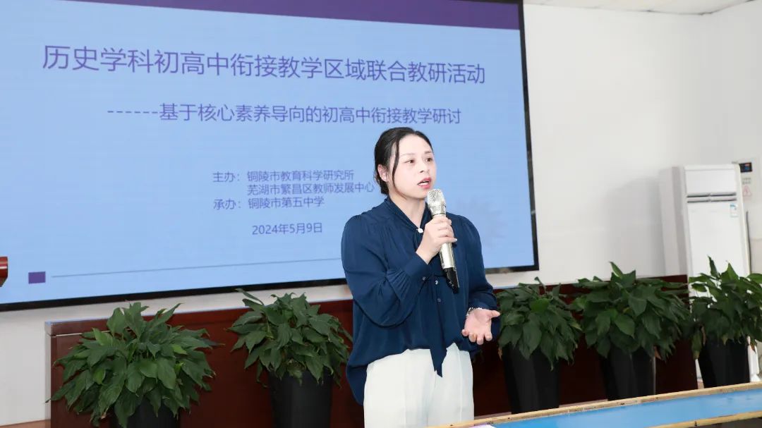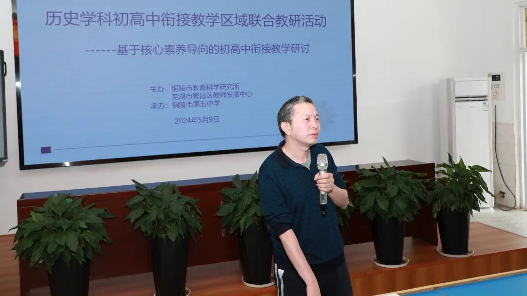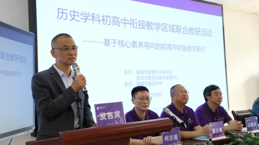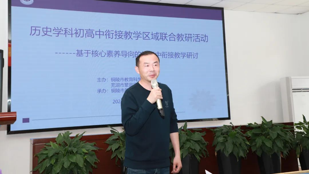 為進(jìn)一步加強(qiáng)跨區(qū)域教研合作,共同探索雙新背景下初、高中貫通培養(yǎng)新路徑,促進(jìn)初高中歷史教學(xué)的深度融合,2024年5月9日,由銅陵市教科所與蕪湖市繁昌區(qū)教師發(fā)展中心聯(lián)合主辦的歷史學(xué)科初高中銜接教學(xué)主題研討活動(dòng)在銅陵五中順利舉行,來自銅陵一縣三區(qū)及市直學(xué)校、蕪湖市繁昌區(qū)90余名初高中歷史教師齊聚一堂,開啟了一場(chǎng)中學(xué)歷史學(xué)科的學(xué)術(shù)盛宴;顒(dòng)由銅陵市兼職歷史教研員、銅陵五中歷史教研組長(zhǎng)柯志強(qiáng)主持。