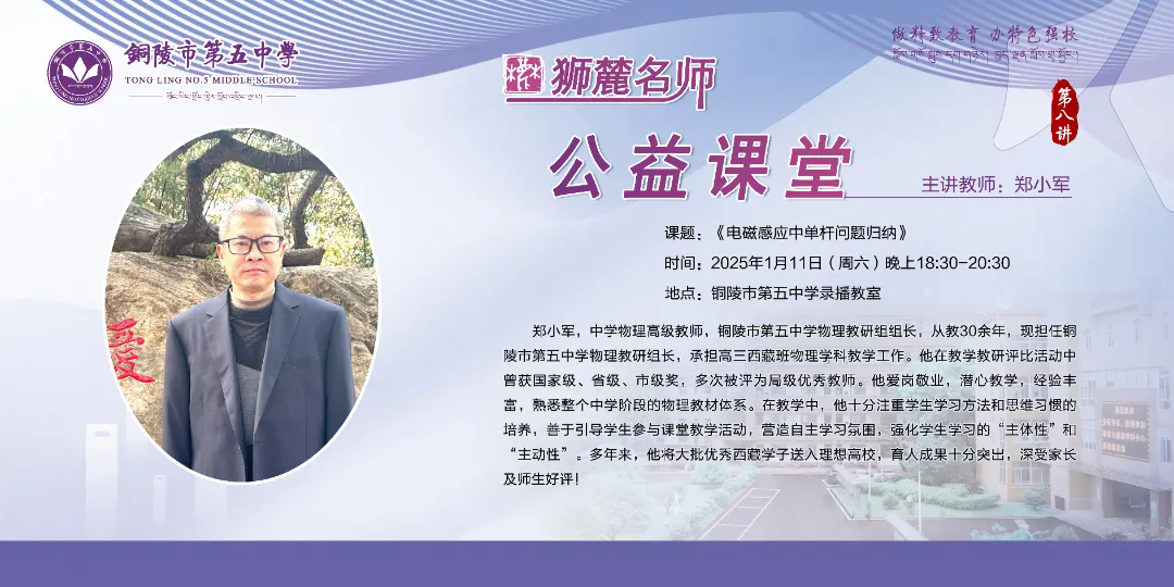 為展示校內(nèi)優(yōu)秀教師的教學(xué)研究成果,幫助高三畢業(yè)班學(xué)生提升突破物理學(xué)科難點(diǎn)的能力,1月11日晚,獅麓名師公益課堂第八講在校錄播室成功舉辦。本次活動(dòng)由銅陵五中主辦,面向全市高三學(xué)生開(kāi)放。銅五獅麓名師鄭小軍老師以《電磁感應(yīng)中單桿問(wèn)題歸納》為課題,用一場(chǎng)精彩的授課,為廣大校內(nèi)外高三學(xué)子帶來(lái)了非同尋常的物理體驗(yàn)。