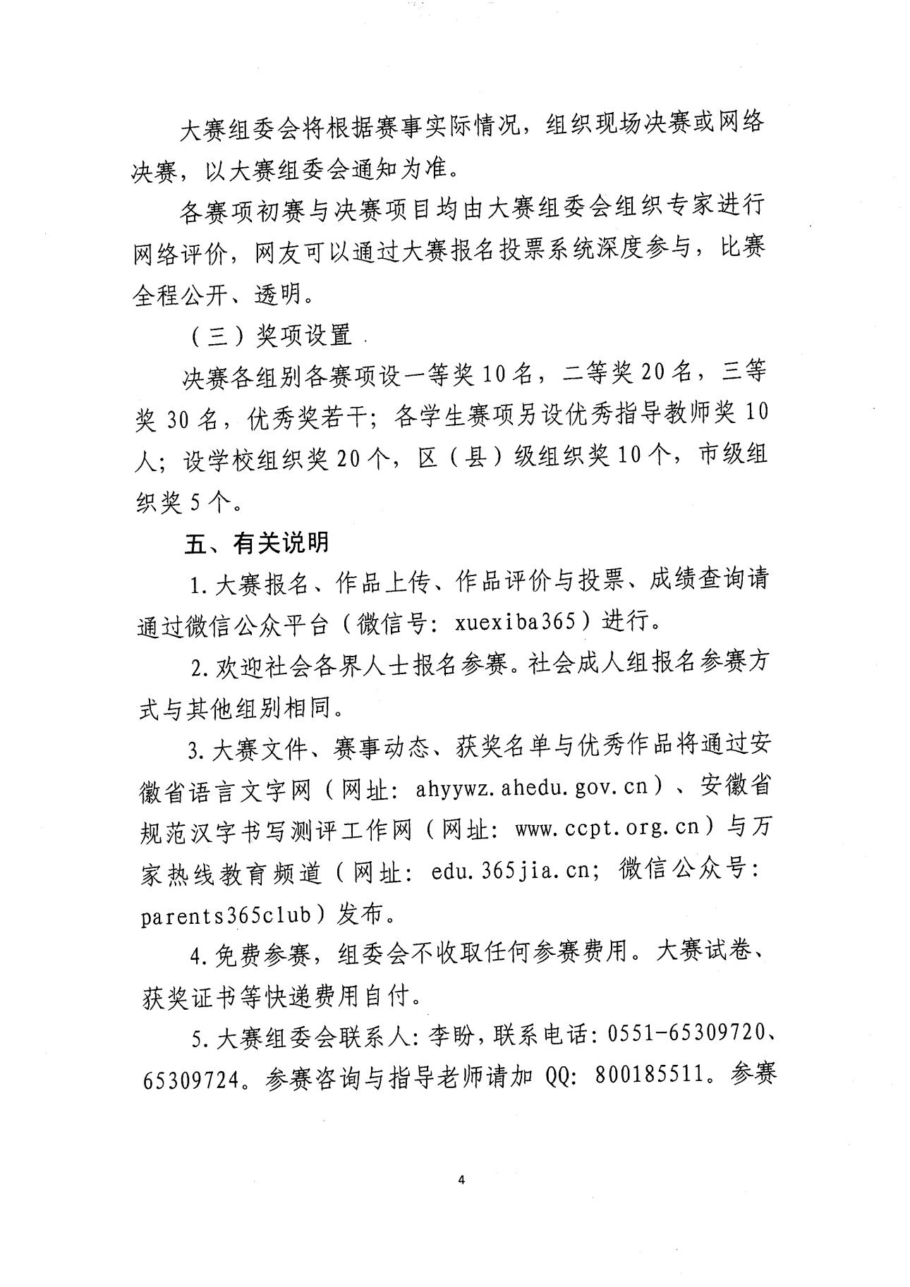 本次大賽不收?qǐng)?bào)名費(fèi),具體書(shū)寫內(nèi)容及要求、參賽辦法、獎(jiǎng)項(xiàng)設(shè)置詳見(jiàn)附件。本次大賽納入第19屆全國(guó)推廣普通話宣傳周安徽省系列活動(dòng)之中。國(guó)家級(jí)、省級(jí)、市級(jí)語(yǔ)言文字規(guī)范化示范校、規(guī)范漢字書(shū)寫教育特色學(xué)校應(yīng)以參加這次大賽為契機(jī),進(jìn)一步加強(qiáng)漢字書(shū)寫教育,提高師生規(guī)范漢字書(shū)寫水平。