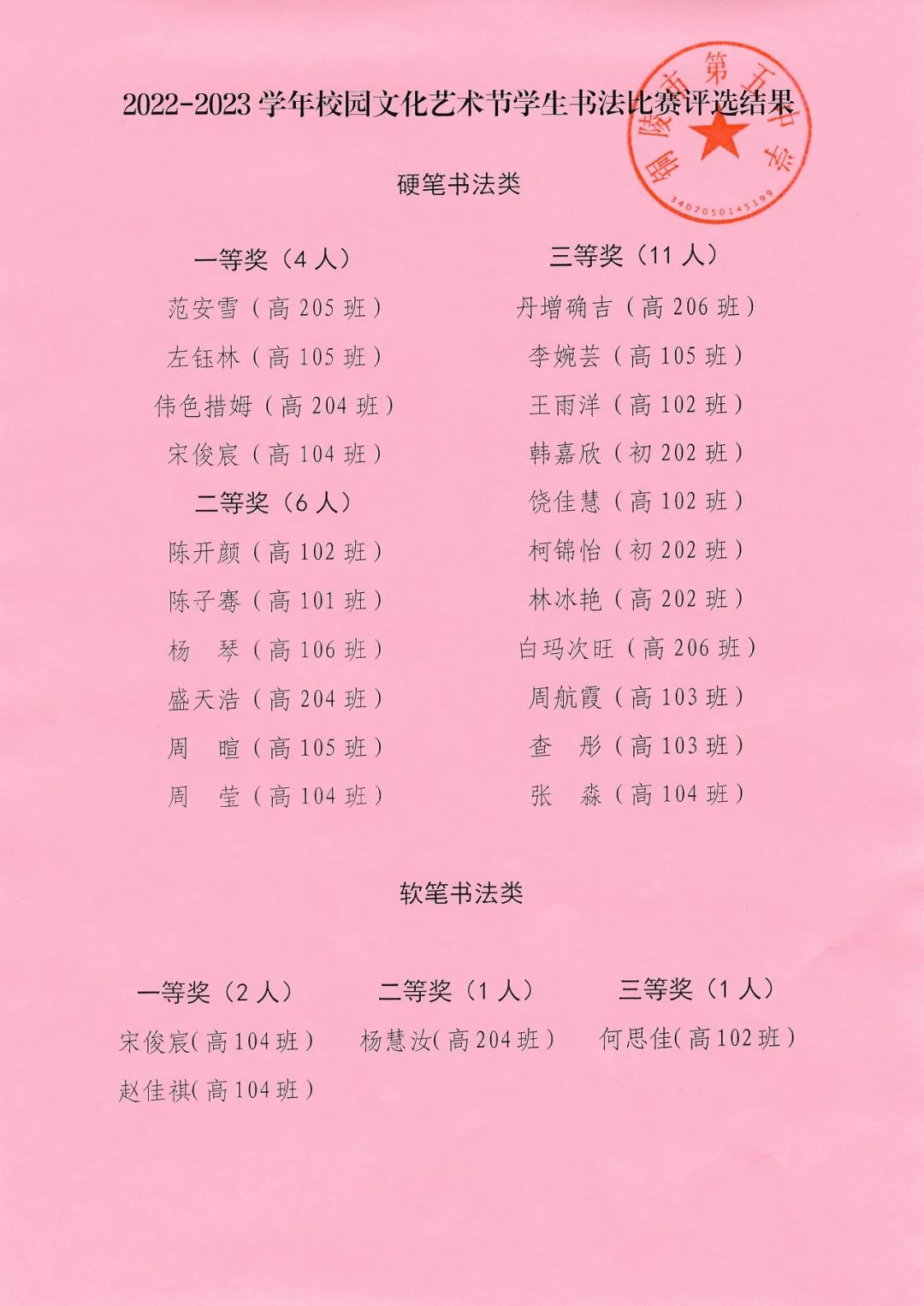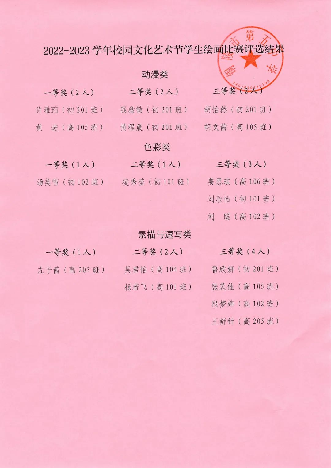 此次學生書畫比賽,學校成立了以藝術組老師為主要成員的評委組,比賽結束后,經評委組老師對參賽作品評分合議,最終評選出硬筆書法作品一等獎4人、二等獎6人、三等獎11人;軟筆書法類作品一等獎2人、二三等獎各1人;動漫類繪畫作品一、二、三等獎各2人;色彩類繪畫作品一二等獎各1人、三等獎3人;素描與速寫類繪畫作品一等獎1人、二等獎2人、三等獎4人。具體獲獎名單如下: