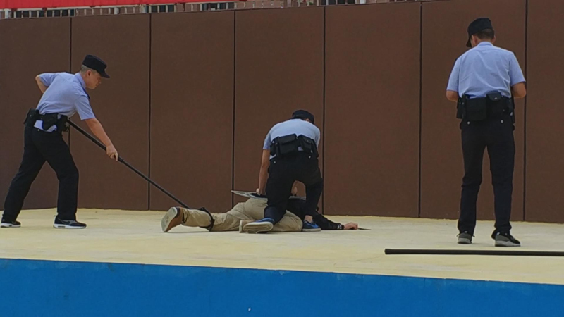 活動中,民警們還舉行了反恐防暴的演練:假想一名“恐怖分子”持刀到到學校門口,隨時可能出現(xiàn)砍傷師生的情況,民警接警后第一時間趕到現(xiàn)場,將“恐怖分子”制服并帶走。