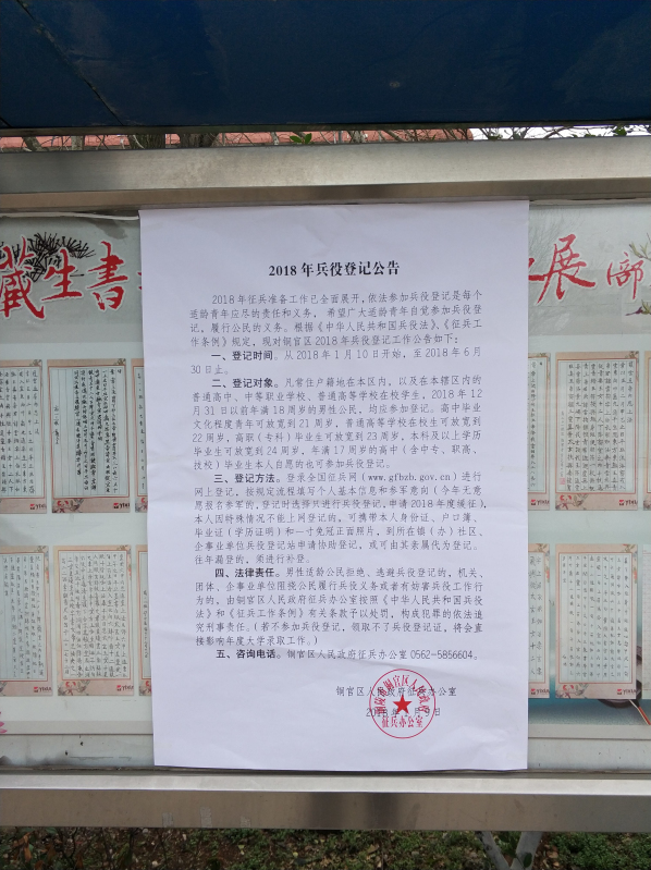 會后,政教處在校園多處張貼《2018年兵役登記公告》。