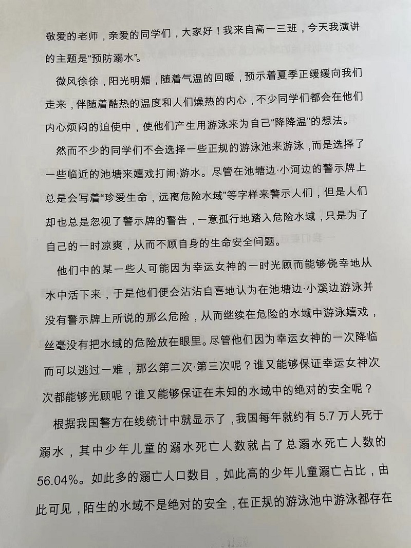 5月18日上午,來自高103班劉詩(shī)語(yǔ)同學(xué)利用校廣播形式進(jìn)行全校大課間講話,向全體同學(xué)發(fā)出倡議,呼吁大家都要提高自己的安全意識(shí)和自護(hù)自救能力,認(rèn)真學(xué)習(xí)防溺水的知識(shí),牢記防溺“四牢記”,要把學(xué)到的防溺水知識(shí)運(yùn)用于實(shí)際,堅(jiān)決杜絕溺水事件的發(fā)生。