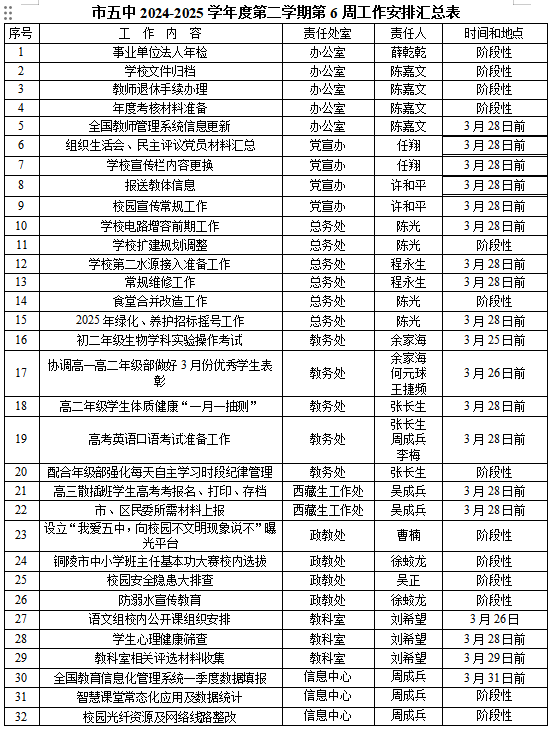 市五中2024-2025學年度第二學期第6周工作安排匯總表