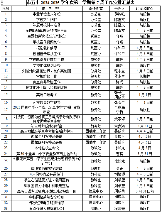 市五中2024-2025學年度第二學期第7周工作安排匯總表
