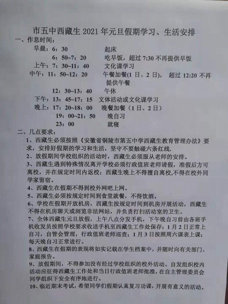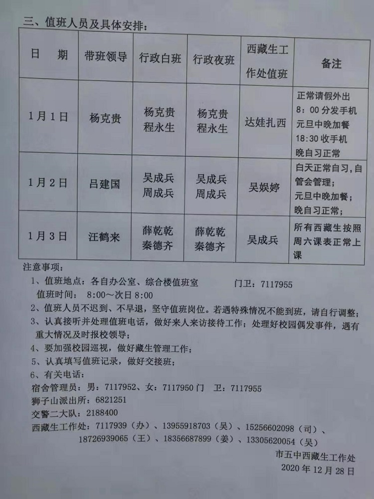 經(jīng)學校研究,考慮到疫情防控的因素,三天假期的學習生活安排還是安排得井然有序、溫馨周到。元旦一天,學生可以領(lǐng)取手機分時段份男女請假外出購物活動;西藏生文體活動中心開放;在西藏生自主管理委員會組織下開展有益的活動;中午晚上食堂加餐。穿藏服、唱藏歌、跳鍋莊、球類比賽,西藏生自主管理委員會的同學早有計劃。元月2日,全體西藏生在西藏生自主管理委員會的組織下在各自教室上自習;中午晚上食堂加餐。元月3日,按照年級補缺補差。
