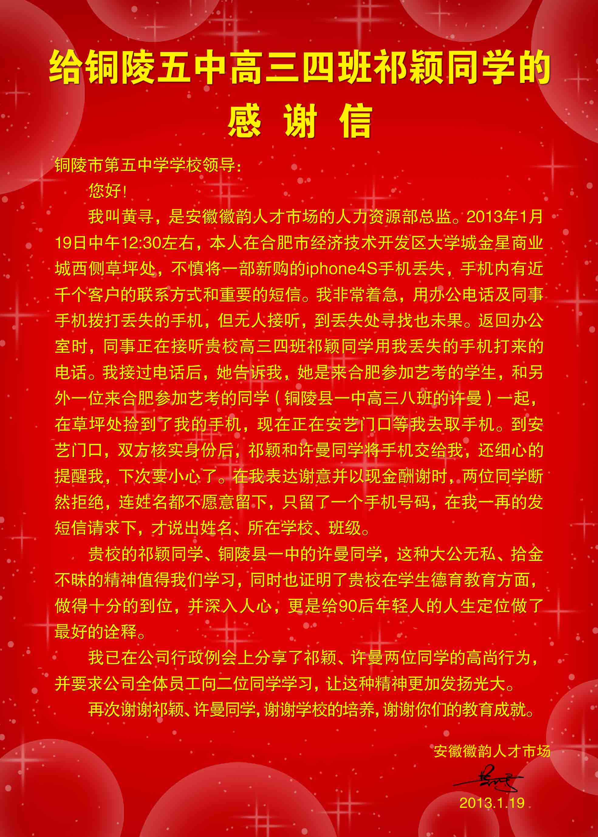 原來(lái),黃總監(jiān)在合肥市經(jīng)濟(jì)技術(shù)開發(fā)區(qū)大學(xué)城金星商業(yè)城西側(cè)草坪處,不慎將一部新購(gòu)的iphone4S手機(jī)丟失,而手機(jī)內(nèi)有近千個(gè)客戶的聯(lián)系方式和重要的短信。我校高304班祁穎和另外一位去合肥參加藝考的同學(xué)(銅陵縣一中高三八班的許曼)一起,撿到手機(jī)后,第一時(shí)間將手機(jī)歸還焦急的黃總監(jiān),還細(xì)心的提醒他,下次要小心。在黃總監(jiān)表達(dá)謝意并以現(xiàn)金酬謝時(shí),兩位同學(xué)斷然拒絕,連姓名都不愿意留下。后來(lái),在他的一再請(qǐng)求下,兩位同學(xué)才說(shuō)出姓名、所在學(xué)校、班級(jí)。