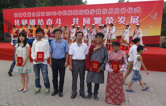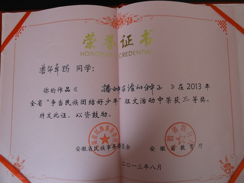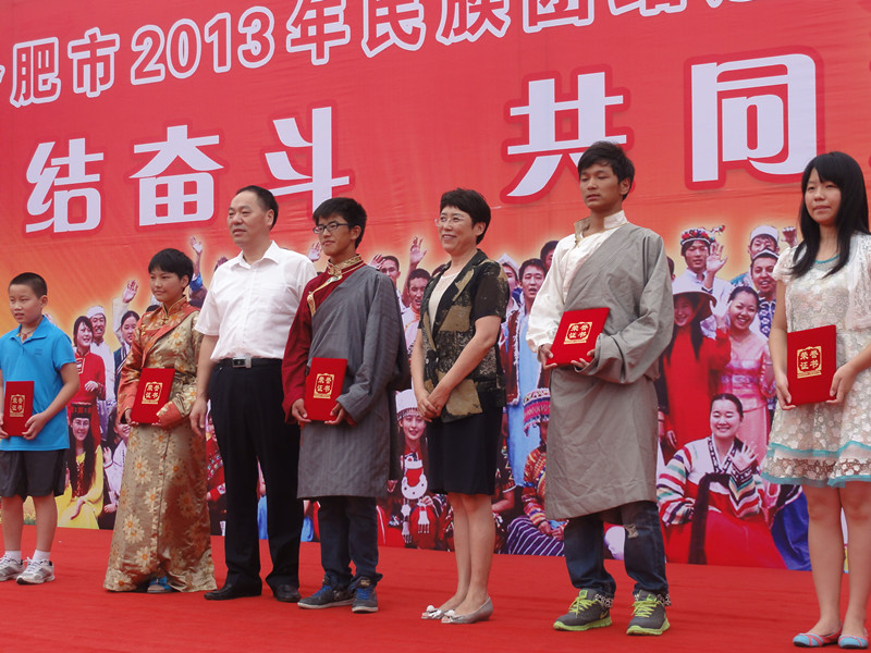 據(jù)悉,這次征文比賽自7月份文件發(fā)至各地市民委、教育局后,得到全省各民族小學(xué)、全省各地初級(jí)中學(xué)、內(nèi)地新疆班、內(nèi)地西藏班的大力支持,學(xué)生更是積極投稿參賽。經(jīng)省民委、省教育廳聘請(qǐng)的在肥高校老師的認(rèn)真嚴(yán)格的評(píng)選,評(píng)委會(huì)選出10名一等獎(jiǎng)、20名二等獎(jiǎng),30名三等獎(jiǎng)。我校無論是獲獎(jiǎng)等次、還是獲獎(jiǎng)人數(shù)均是參賽眾多學(xué)校中成績(jī)最好。在8月30日舉辦的“安徽省暨合肥市民族團(tuán)結(jié)進(jìn)步宣傳月”啟動(dòng)儀式上,省委常委、省統(tǒng)戰(zhàn)部部長(zhǎng)沈素麗、安徽省副省長(zhǎng)方春明出席,省教育廳副廳長(zhǎng)金燕親自為我校獲獎(jiǎng)學(xué)生頒發(fā)證書,并鼓勵(lì)我校獲獎(jiǎng)學(xué)生努力學(xué)習(xí),再接再厲。