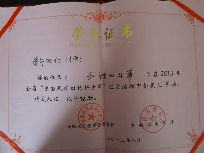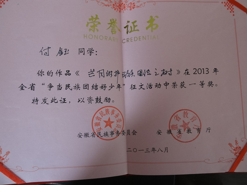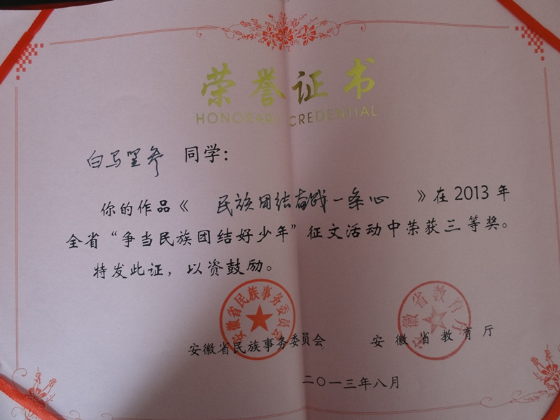 在剛剛結(jié)束的安徽省民委、安徽省教育廳聯(lián)合舉辦的“爭(zhēng)當(dāng)民族團(tuán)結(jié)好少年”征文比賽中,我校選送的原高203班付鈺同學(xué)的《共同維護(hù)民族團(tuán)結(jié)之樹》一文獲得省一等獎(jiǎng),原高202班的普布次仁、白瑪堅(jiān)參、普布卓瑪三名同學(xué)三篇征文均獲得三等獎(jiǎng)。