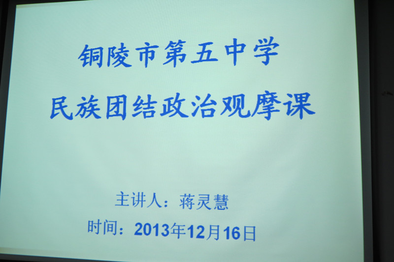 按照今年年初制定的《銅陵市第五中學(xué)民族團結(jié)教育活動方案》,一年來,我校陸續(xù)開展一系列的民族團結(jié)教育活動。學(xué)校領(lǐng)導(dǎo)的大力支持,各部門的積極配合,廣大教職工的熱心奉獻,全體學(xué)生,尤其是在校近130名西藏生的廣泛參與,使得我校的民族團結(jié)活動開展得有聲有色,成效凸顯,碩果累累,得到各級領(lǐng)導(dǎo)充分肯定,得到廣大西藏生家長的高度贊許。這次民族團結(jié)政治觀摩課活動,是我校民族團結(jié)教育系列活動之一,和即將舉辦的我校藏漢學(xué)生迎新文藝匯演一起,為我校2013年民族團結(jié)教育活動劃上圓滿的句號。