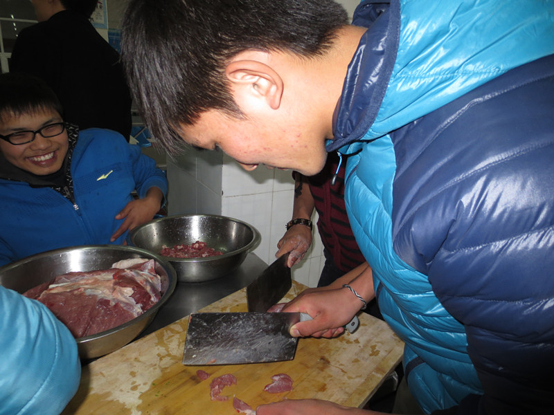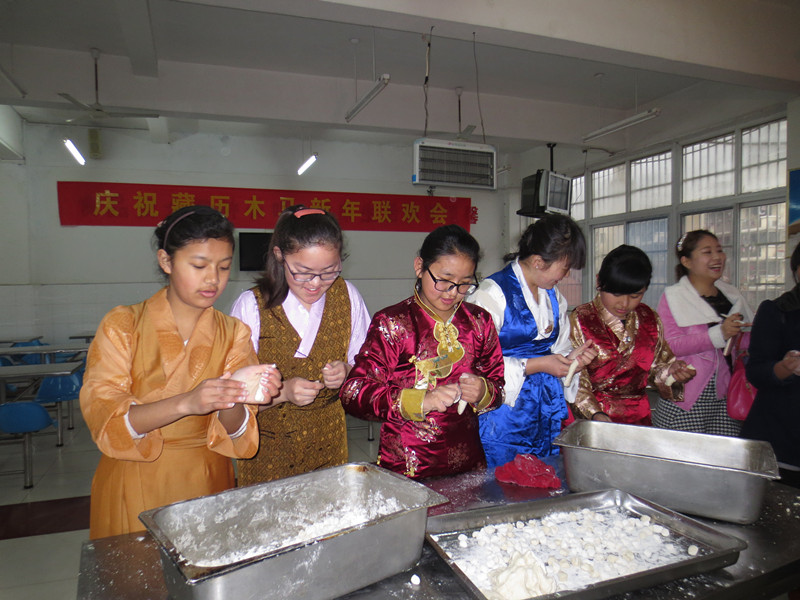 2月28日,周五,是藏歷傳統(tǒng)的古突節(jié)。我校高一、高二90名西藏生在下午最后一堂課就聚在一起。食堂師傅早早地就準備好了孩子們要的材料:面粉、豬肉、蘿卜、菠菜,孩子們穿上藏服,揉、和、捏、揀、洗、切,程序井井有條;鍋、碗、瓢、盆、勺、鏟,響聲陣陣悅耳。食堂各位師傅從旁指導,西藏生工作處老師旁觀助興,連一直跟蹤采訪的市電視臺的幾名記者也躍躍欲試。說笑著、評論著、回憶著、分享著,有序、喜慶、開心、和樂。