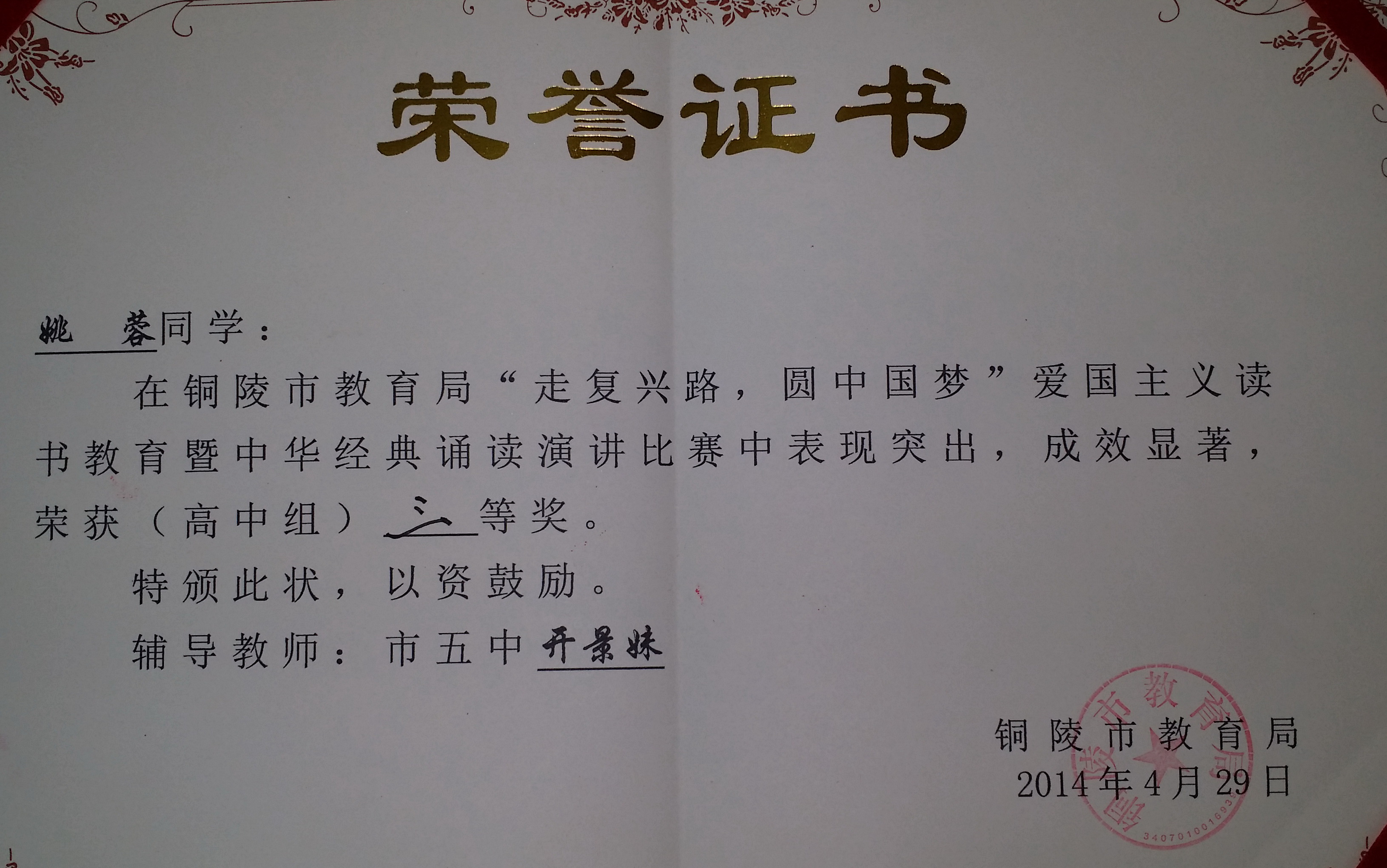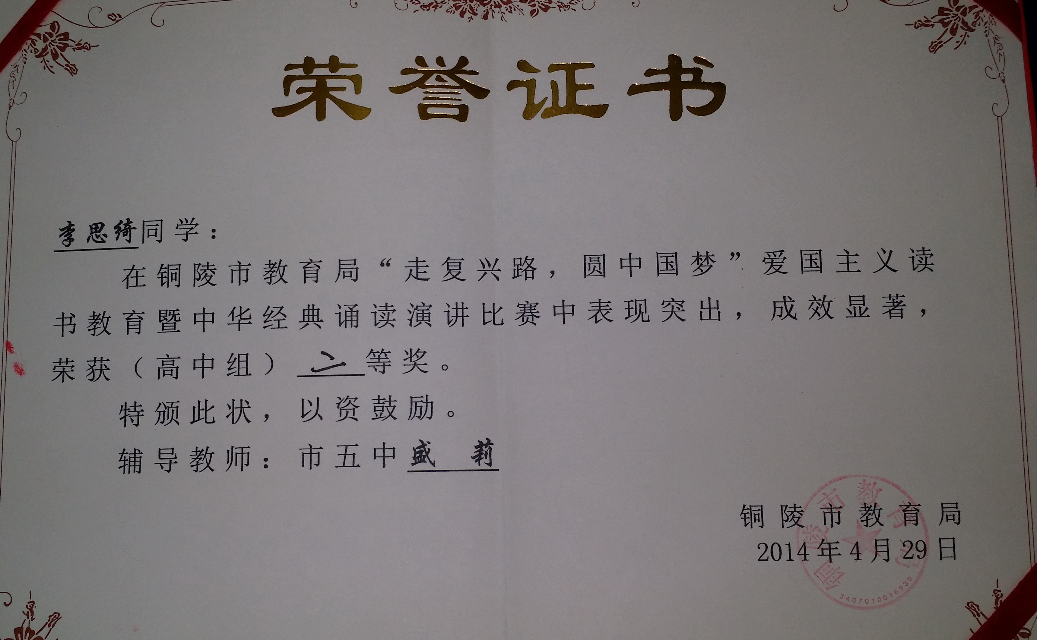 在今天上午市教育局組織的“走復興路,圓中國夢”愛國主義教育讀書活動演講比賽中,我校高106班李思綺同學和高205班姚蓉同學分獲高中組二、三等獎。