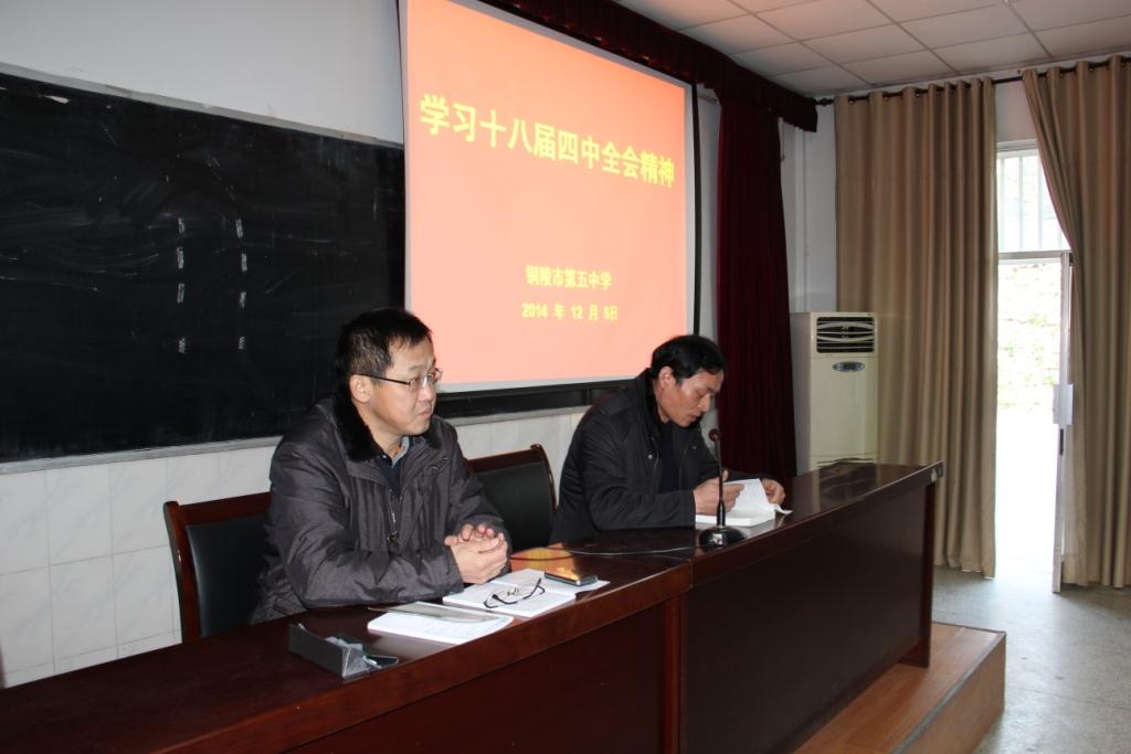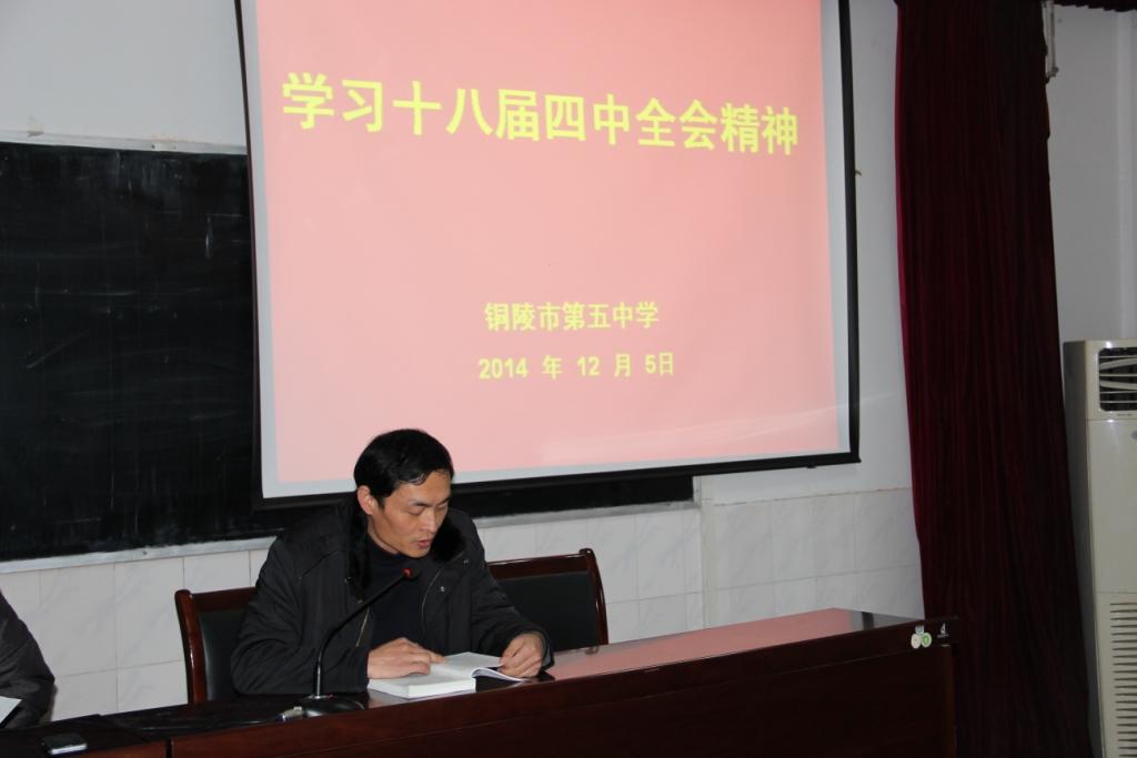12月5日下午,我校組織全體教職工于學(xué)校階梯教室開展十八屆四中全會(huì)精神專題學(xué)習(xí)會(huì),學(xué)校黨支部副書記楊克貴帶領(lǐng)大家學(xué)習(xí)十八屆四中全會(huì)精神。同時(shí),學(xué)校將深入學(xué)習(xí)十八屆四中全會(huì)精神列入本學(xué)期重點(diǎn)工作,確保其有序有效地進(jìn)行。11月下旬,學(xué)校分發(fā)了《<中共中央關(guān)于全面推進(jìn)依法治國(guó)若干重大問題的決定>輔導(dǎo)讀本》,各學(xué)科教研組積極組織本組黨員同志進(jìn)行了討論和學(xué)習(xí)。