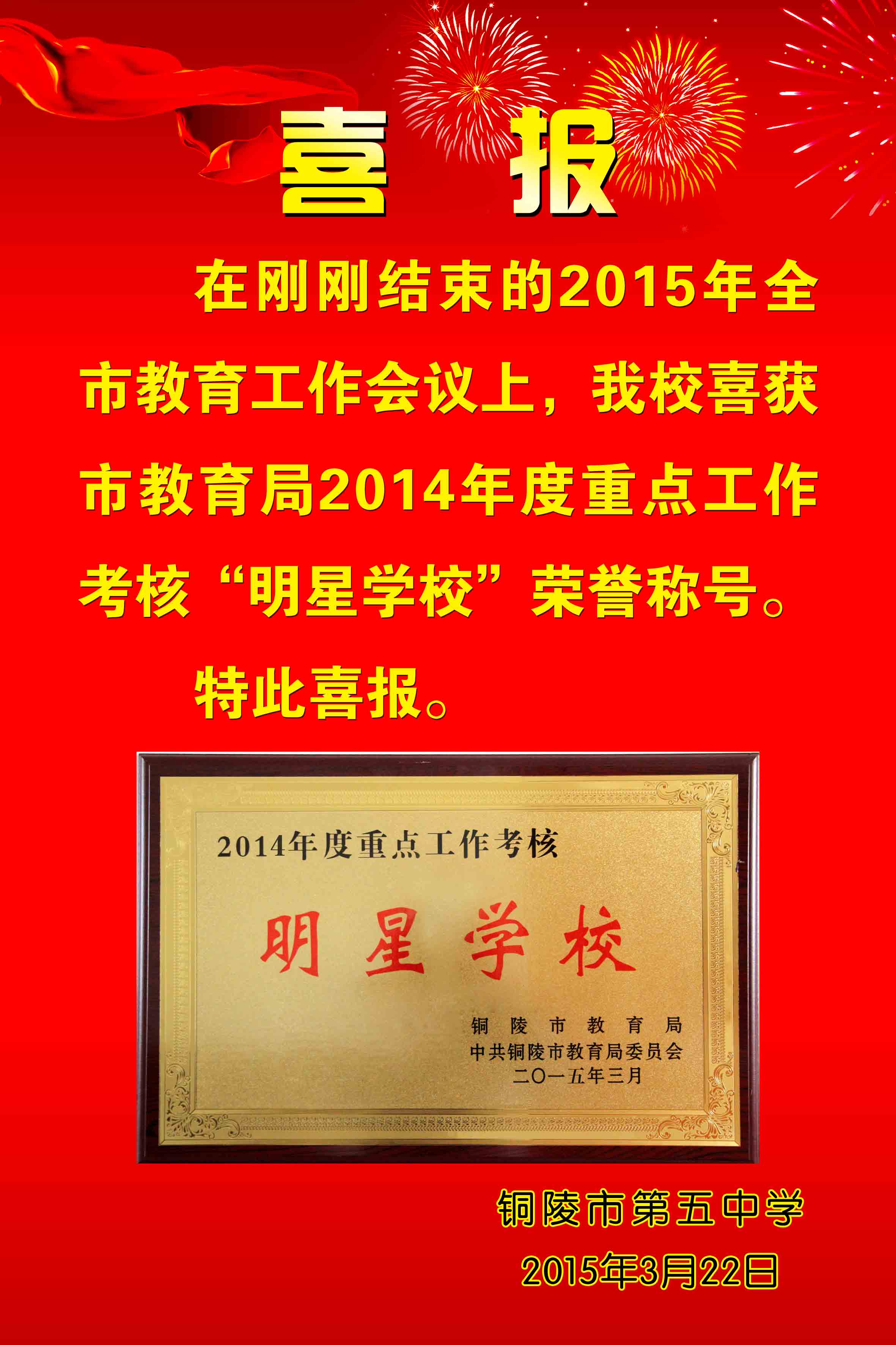 在剛剛結束的全市教育工作會議上,我校在2014年度學校重點工作考核中獲“明星學!惫鈽s稱號,特此報喜,感謝大家的努力拼搏!