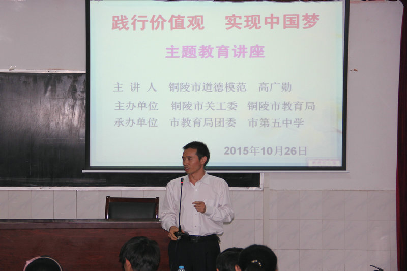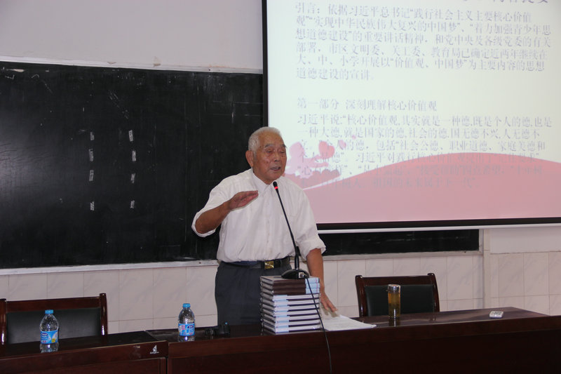 宣講活動(dòng)中,近85歲高齡的高廣勛老人用講故事的方式回顧了自己接受黨的關(guān)懷教育,成人后一直用實(shí)際行動(dòng)報(bào)答黨恩的經(jīng)歷。近50分鐘的演講,高老全部站著完成,他用自己的實(shí)際行動(dòng)向五中學(xué)子們生動(dòng)地展示了責(zé)任的意義,他用自己的親身經(jīng)歷深刻地闡明了踐行社會(huì)主義核心價(jià)值觀的重要性。全體學(xué)生被高老散發(fā)出來的道德力量深深震撼,所有的感動(dòng)和尊敬都化為雷鳴般的掌聲。
