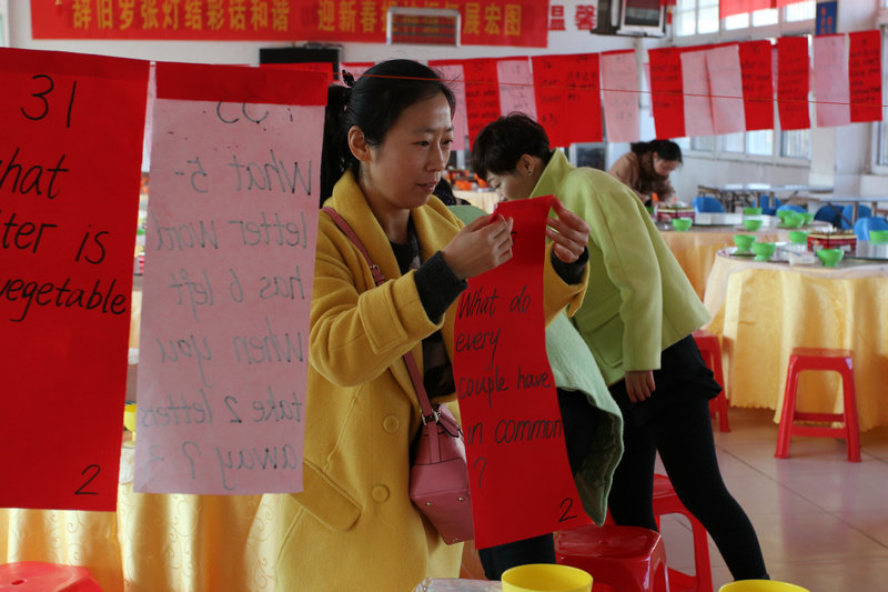 第一個游戲項目是英語猜謎游戲,食堂大廳掛滿了紅紙,每張紅紙上都用英語寫上了一則謎語,同學們根據(jù)老師口令進入食堂大廳,選擇知道謎底的紅紙接下并用英語寫上答案后交給裁判,裁判根據(jù)答案的正誤確定學生是否得分。舒老師“開始”口令話音未落,同學們就一窩蜂的涌進了食堂大廳,“瘋狂”地尋找知道謎底的謎語。高301班的旺珍雖然是女生,但動作敏捷,游戲剛開始不到兩分鐘,她的手上就已經(jīng)拿到了四張謎語,看她的表情,對謎底已經(jīng)胸有成竹了。而高302班的嘎瑪則兩手空空,他一臉沮喪的在“謎語林”中尋尋覓覓,心里一定在懊悔單詞背的太少。短短十分鐘,“謎語林”中的一百多則謎語就被大家“一搶而空”。 在第一輪游戲環(huán)節(jié)勝出的同學一臉笑意,得意洋洋,而失利的同學則暗暗發(fā)力,想在下輪游戲中一掃前恥,后來居上。