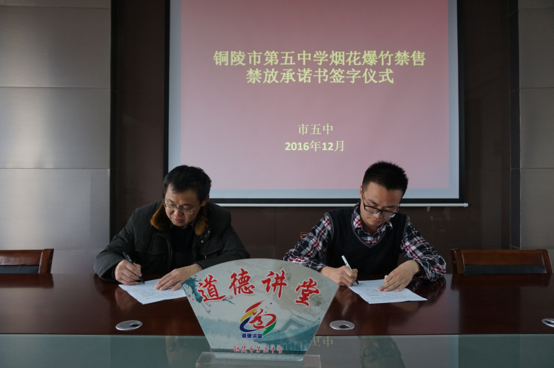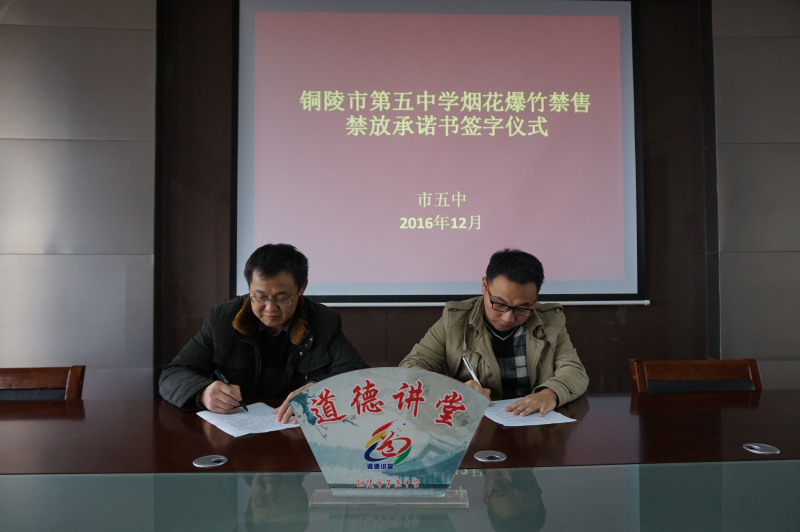根據(jù)《銅陵市燃放經(jīng)營煙花爆竹管理規(guī)定》和銅陵市人民政府第104次常務(wù)會(huì)議精神,從2017年1月1日起,銅陵市將在中心城區(qū)禁止燃放煙花爆竹,為切實(shí)做好禁止燃放煙花爆竹宣傳教育工作,我校開展道德講堂活動(dòng)--煙花爆竹禁售禁放承諾簽字儀式。