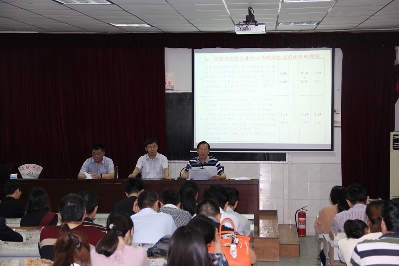 為確保2017年安徽省初中學(xué)業(yè)水平考試工作順利有序的進(jìn)行,市五中2017年初中學(xué)業(yè)水平考試考務(wù)工作培訓(xùn)會于6月13日上午8:30準(zhǔn)時在階梯教室舉行,來自市直各校的監(jiān)考人員與市五中考點(diǎn)的考務(wù)、后勤保障、保衛(wèi)共80多名教師參加了培訓(xùn)會。