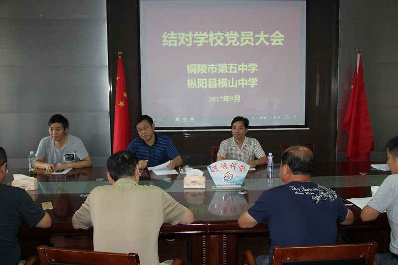 9月8日下午,市五中與樅陽(yáng)縣橫山中學(xué)聯(lián)席黨員大會(huì)在我校召開(kāi)。會(huì)議由市五中黨支部書(shū)記、校長(zhǎng)沐揚(yáng)主持,橫山中學(xué)校長(zhǎng)吳禮高、橫山中學(xué)辦公室、教務(wù)處和政教處負(fù)責(zé)人和市五中全體黨員出席了會(huì)議。