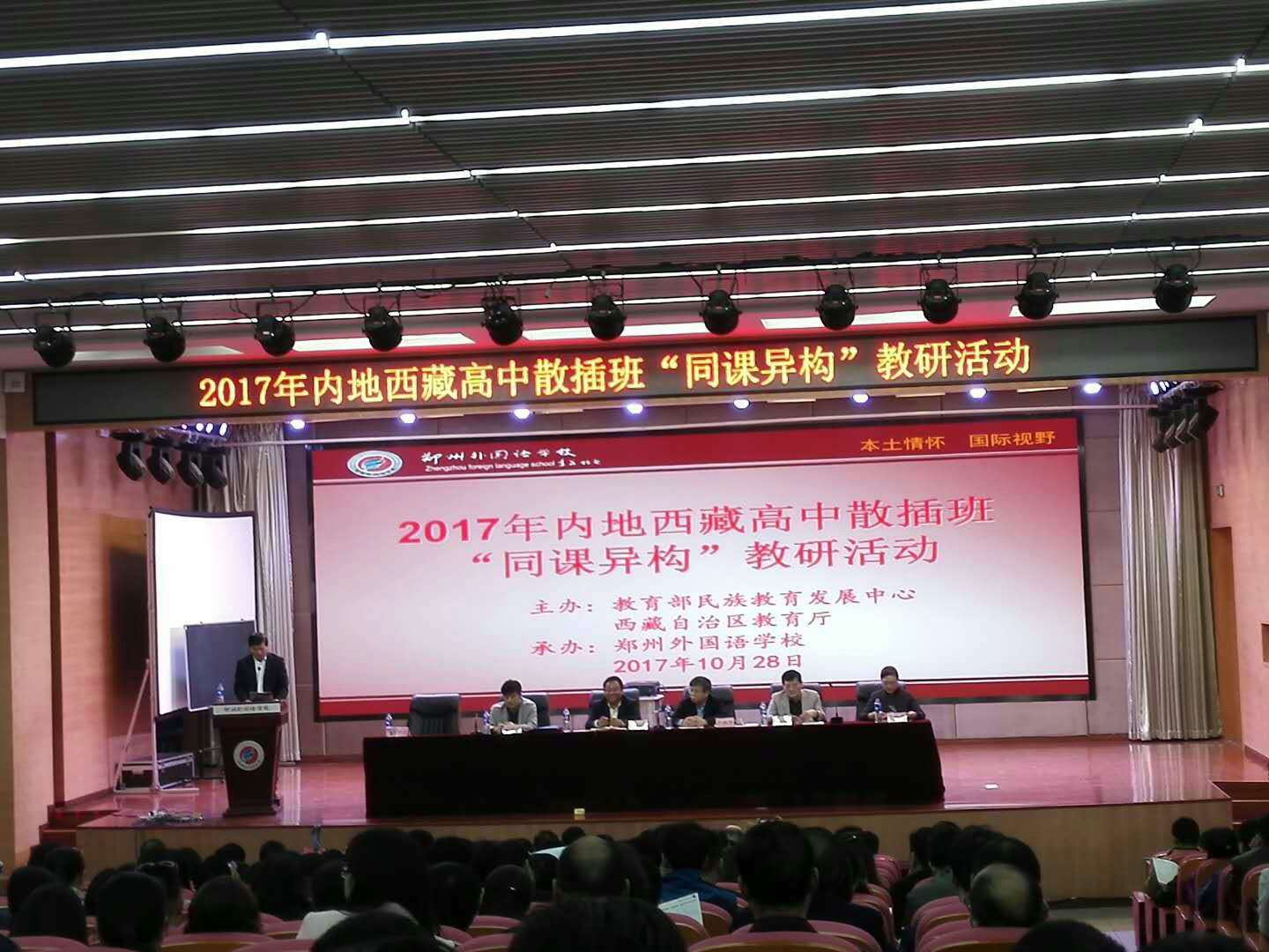 為深入貫徹十九大精神,讓西藏的孩子充分享受內(nèi)地優(yōu)質(zhì)教育資源、接受公平教育,加強(qiáng)內(nèi)地西藏散插班之間的教學(xué)交流,提升內(nèi)地西藏散插班的教學(xué)質(zhì)量,2017年內(nèi)地西藏高中散插班“同課異構(gòu)”教研活動(dòng)于10月27日至29日在河南省鄭州市外國(guó)語(yǔ)學(xué)校舉行。活動(dòng)由教育部民族教育發(fā)展中心和西藏自治區(qū)教育廳聯(lián)合舉辦、鄭州外國(guó)語(yǔ)學(xué)校承辦。我校生物教師薛乾乾、英語(yǔ)教師王澈以及來(lái)自全國(guó)各地內(nèi)地西藏班的27名優(yōu)秀教師應(yīng)邀參加了“同課異構(gòu)”展示課活動(dòng)。