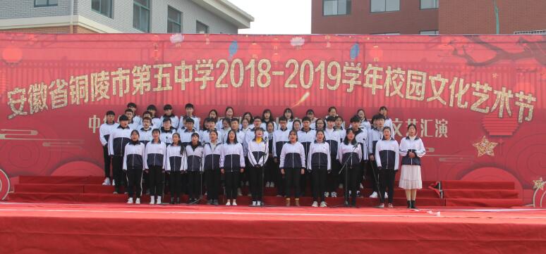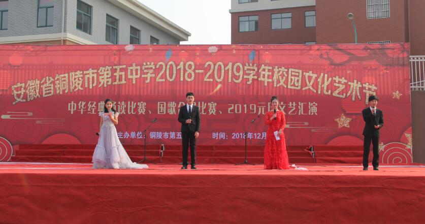 2018年12月24日周一,銅陵市第五中學(xué)開展了2019年元旦文藝匯演暨校園藝術(shù)節(jié)。本次慶;顒(dòng)分以下內(nèi)容,國(guó)歌合唱比賽,中華經(jīng)典誦讀,元旦文藝匯演。學(xué)生們熱情洋溢,老師們傾力指導(dǎo)。元旦文藝晚會(huì)形式多樣,動(dòng)靜結(jié)合,精彩不斷,高潮迭起,為現(xiàn)場(chǎng)觀眾獻(xiàn)上一場(chǎng)精彩絕倫的視聽盛宴,同學(xué)們?cè)谕頃?huì)中也彰顯青春展示了我校昂揚(yáng)向上,朝氣蓬勃的精神風(fēng)貌。