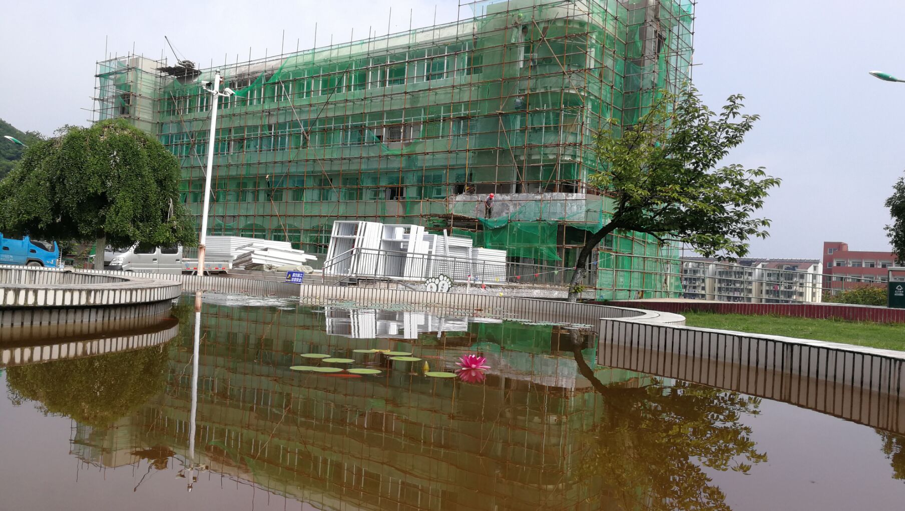 暑假已經(jīng)開始一周多了,此時走進沒有學(xué)生銅陵五中大門,校園顯得格外的整潔、寧靜。穿過大門后的小廣場,拾階而上,43級臺階之后,突然映入眼簾的卻是一派繁忙的景象:教學(xué)圖書樓、科學(xué)館的外墻已基本鏟除,工人師傅人井然有序的忙碌其中……
