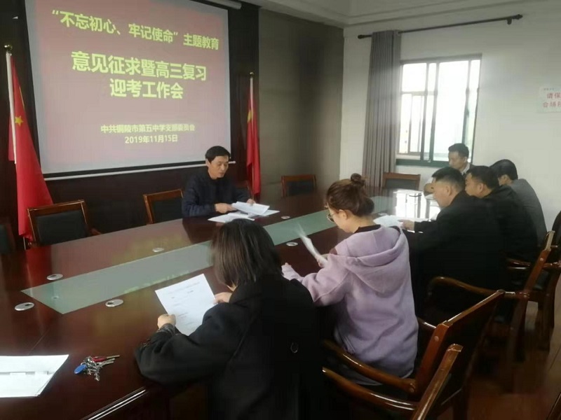 11月15日下午,我校召開“不忘初心、牢記使命”主題教育意見征求暨高三復習迎考工作會。高三年級部成員與高三年級班主任參加會議,會議由校黨支部副書記、高三年級部部長楊克貴主持。