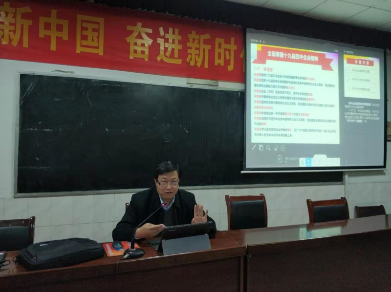 為深入學習宣傳黨的十九屆四中全會精神,動員全體教職工尤其是黨員教師把思想和行動統(tǒng)一到全會精神上來,推深做實“不忘初心、牢記使命”主題教育,更好加強黨風廉政建設。12月20日,我校邀請中共銅陵市委黨校政治教研室主任汪洋教授給全體教職工開展黨的十九屆四中全會精神宣講活動。