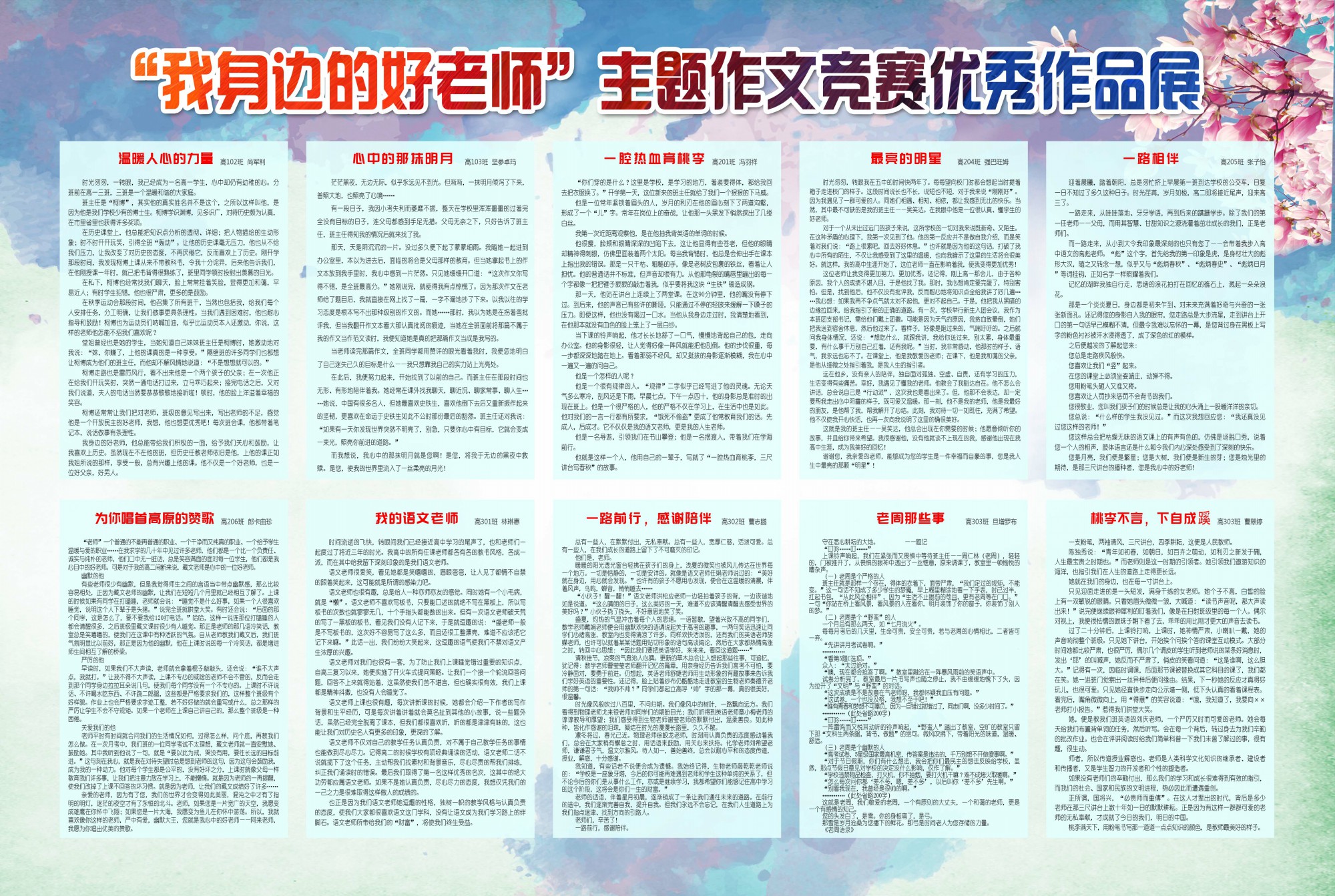 為了推動(dòng)我校作文教學(xué)工作,激發(fā)學(xué)生的寫作興趣,提高廣大學(xué)生寫作能力,同時(shí)為了弘揚(yáng)正能量,宣傳教師隊(duì)伍中的先進(jìn)事跡,2019年12月學(xué)校舉行了全校學(xué)生同寫一篇作文、以“我身邊的好老師”為主題的作文競(jìng)賽活動(dòng)。經(jīng)評(píng)審,初中組獲一等獎(jiǎng)9篇、二等獎(jiǎng)14篇、三等獎(jiǎng)15篇,高中組獲一等獎(jiǎng)13篇、二等獎(jiǎng)16篇、三等獎(jiǎng)25篇。學(xué)校將把學(xué)生獲獎(jiǎng)作文編輯成冊(cè),供全校師生鑒賞,并選出20篇優(yōu)秀作文舉行作品展。