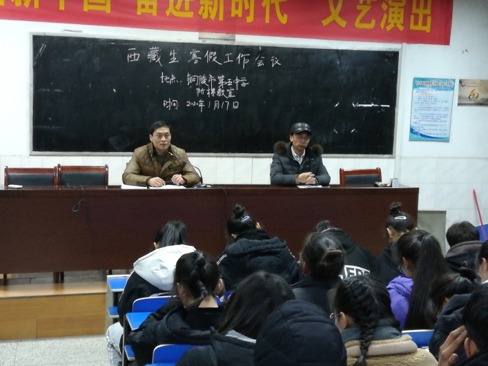 1月17晚,期末考試結(jié)束,寒假還沒(méi)有拉開(kāi)序幕,我校就在階梯教室召開(kāi)西藏生工作會(huì)議。分管西藏生工作的校支部副書(shū)記楊克貴、西藏生工作處吳成兵、司家龍及全體留校西藏生出席會(huì)議。