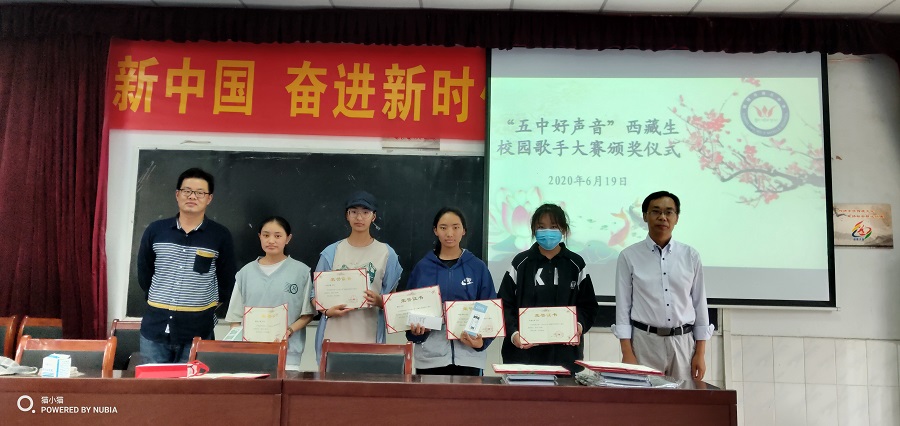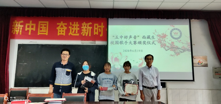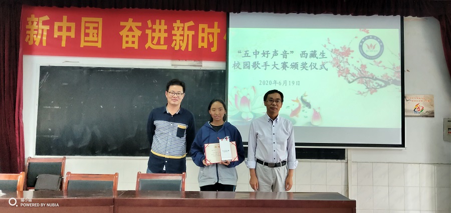 為了進一步豐富我校西藏生的校園文化生活,營造積極向上、格調(diào)高雅、健康文明的校園文化氛圍,展示我校西藏生多才多藝、團結(jié)創(chuàng)新、銳意進取、蓬勃向上的精神風貌,讓歌聲見證青春成長,用旋律為夢想起航。近日,我校西藏生工作處特主辦“五中好聲音”西藏生校園歌手大賽。經(jīng)過兩個星期的層層選拔比賽,選手們懷揣著激情與夢想,用他們美妙的歌聲感染著觀眾們的心靈。經(jīng)過激烈角逐后,高二(4)班拉珍等同學獲得本次比賽的獎項。6月19日下午,西藏生工作處全體老師出席頒獎儀式,為獲獎同學們送上證書及獎品。并鼓勵他們再接再厲,培養(yǎng)興趣愛好,豐富學習生活。